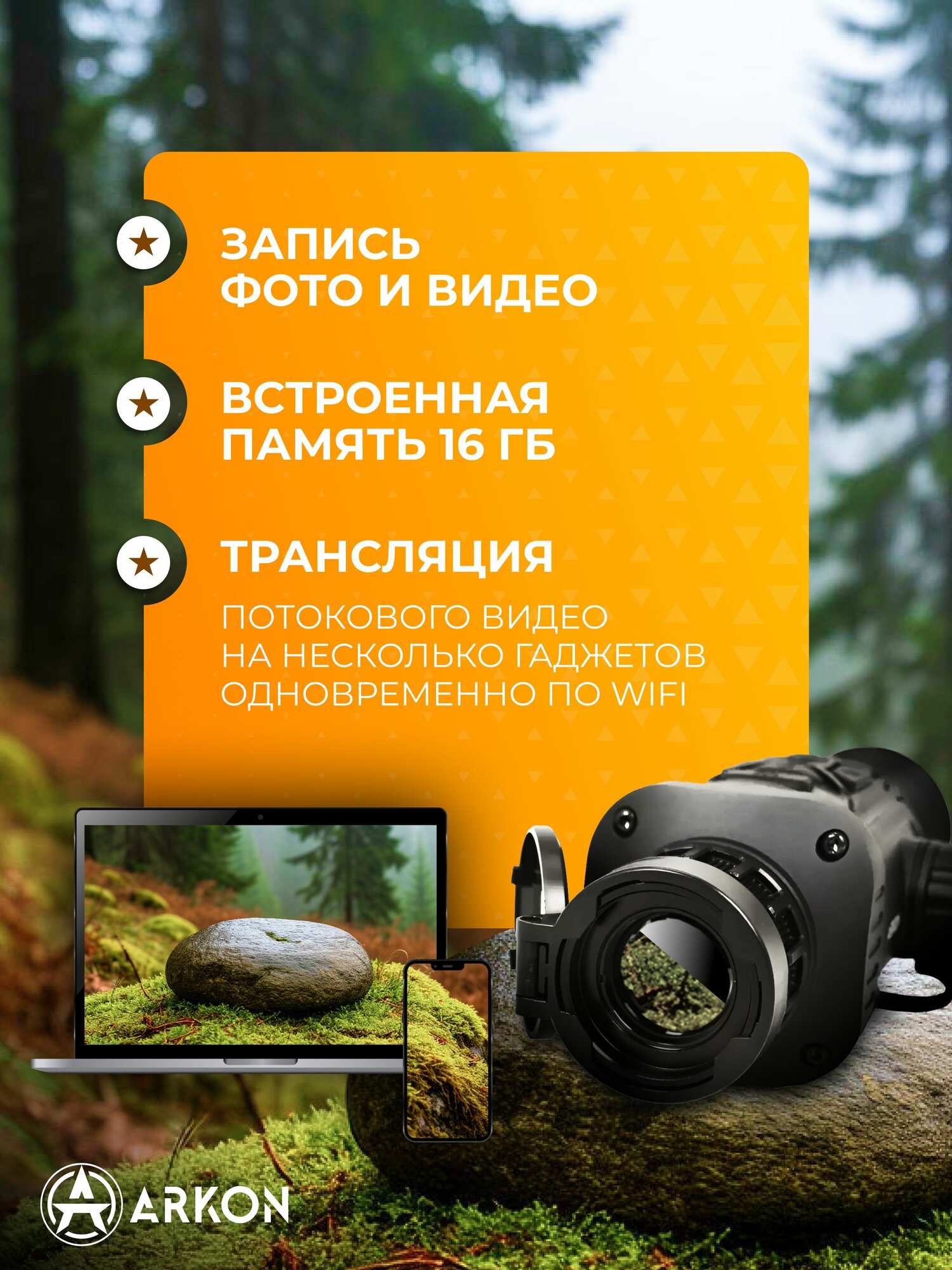 Тепловизионный прицел Arkon Arma SR25 оснащен модулем Wi-Fi, способным работать в режиме «Точка доступа», раздавая сигнал потокового видео сразу на несколько цифровых гаджетов. Для сопряжения и совместной работы потребуется установить фирменное мобильное приложение, скачать которое Вы можете на странице описания. После установки Вам будут доступны: дистанционное управление устройством, просмотр видео, обмен файлами и функция обновления программного обеспечения.