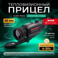 Guide TR450 – компактный тепловизионный прицел новой серии от Guide Sensmart Tech Co, LTD. С заявленной дальностью обнаружения в 2000 метров прибор является высокоэффективным инструментом на любом типе ночных охот. Мощная оптика на 50-ти миллиметровом объективе позволит в деталях рассмотреть любой удаленный объект и точно поразить цель. За качественную тепловизионную картинку отвечает передовой ИК-сенсор VOx 384 × 288 рх. Мельчайшие детали самого объекта и элементов окружающей обстановки можно наблюдать на полноцветном дисплее OLED. К услугам охотников большой набор прицельных сеток, 6 цветовых палитр, встроенные опции видеозаписи, отслеживание горячих точек и многое другое. Прицел с тепловизором Guide TR450 получает только позитивные отзывы от своих владельцев. Прекрасно защищенная от любых погодных капризов оптика значительно повысит качество и результативность Вашей стрельбы. Технические характеристики: - Дальность обнаружения: Человек: 2000 м - Тип: VOx, неохлаждаемый - Разрешение матрицы, пикселей: 384x288 - Шаг детектора, мкм: 12 - Частота обновления кадров, Гц: 50 - Эквивалентная шуму разница температур, NETD: < 30 мК - Тип дисплея: OLED (0.39') - Разрешение дисплея, пикселей: 1024x768 - Цветовые схемы: 6 White Hot, Black Hot, Red Hot, Green Hot, Iron Red, Blue Hot - Настройка изображения: 3 режима наблюдения — Enhanced, Highlight and Natural (улучшенный, высокая яркость, природа) - Увеличение, крат: x4.7-18.8 (оптический зум 4.7x / цифровой зум 1x — 4x) - Объектив: 50 мм / f1.0, ручная фокусировка - Поле зрения, град: 5.27°x3.95° - Удаление выходного зрачка, мм: 48 - Предел перефокусировки окуляра, дптр: +/-4 - Прицельные сетки: 10 шт. - Запись фото / видео: есть - Объём встроенной памяти, ГБ: 32 - Подключение к ПК: USB-C - Дистанция пристрелки: 50 м / 100 м / 200 м / 300 м / 500 м - Функция "картинка в картинке" (PiP): 3 варианта положения окна - Wi-Fi: есть, интеграция с мобильными устройствами Android/iOS через приложение TargetIR - Источник питания: 18650 ёмкостью 3200 мАч (3.65В, Li-Ion, с защитой и выступающим плюсовым контактом), общая длина ~70мм - Время работы, час: до 8 (зависит от ёмкости сменной батареи) - Внешний источник питания: USB-C (5V, 2A) - Режим суперэнегросбережения: есть (яркость экрана 20%, без WiFi) - Ударная стойкость: до 800 G - Класс пыле- и влагозащиты: IP67 - Сертификация: FCC, CE, RoHS, EAC, WEEE, UKCA, un38.3 - Рабочие температуры, °C: -30.+50 - Температура хранения, °C: -45.+70 - Влажность: от 10% до 95%, без конденсата - Установка на оружие: Picatinny - Габариты, мм: 219x88x82 - Масса: 700г