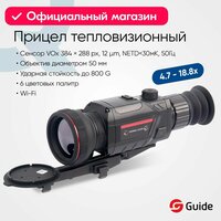 Прицел для охоты GUIDE TR450 Внимание! Товар поставляется по 100% предоплате, перед оплатой уточняйте наличие, сроки и условия доставки у наших консультантов. Доставка в стоимость не включена, оплачивается отдельно. Guide TR450 – компактный прицел новой серии от Guide Sensmart Tech Co, LTD. С заявленной дальностью обнаружения в 2000 метров прибор является высокоэффективным инструментом на любом типе ночных охот. Мощная оптика на 50-ти миллиметровом объективе позволит в деталях рассмотреть любой удаленный объект и точно поразить цель. За качественную тепловизионную картинку отвечает передовой ИК-сенсор VOx 384 × 288 рх. Мельчайшие детали самого объекта и элементов окружающей обстановки можно наблюдать на полноцветном дисплее OLED. К услугам охотников большой набор прицельных сеток, 6 цветовых палитр, встроенные опции видеозаписи, отслеживание горячих точек и многое другое. Прицел для охоты GUIDE TR450 имеет следующие характеристики: Дальность обнаружения объектов: (1,8 х 0,5м) — 2000м. Ванадиевый ИК-сенсор - VOx 384 × 288 рх, 12 μm, NETD<30мК, 50Гц. Цветной OLED дисплей (0.39’’), 50 Гц, 1024х768 пикселей. Шесть цветовых палитр (White Hot, Black Hot, adjustable Red Hot , Green Hot, Iron Red, Blue Hot). Шесть типов прицельных сеток, есть баллистические масштабируемые варианты. Подсветка сеток разным цветом (Черный/белый/желтый/зеленый/красный/синий). Объектив 50мм/f1.0, увеличение 4,7х, Digital zoom x1- x4, угол поля зрения FOV – 5.27° × 3.95°. Функции записи видео, 32 Гб памяти. Видео выход, Wi-Fi модуль, приложение Guide TargetIR. Влагозащищенный корпус, класс IP67. Система питания – сменный аккумулятор 18650. Диапазон рабочих температур: от -30 до +50°С. Габариты 219×88×66 мм, вес 0,59 кг. Особенности Германиевый объектив 50 мм f1.0 Базовая кратность прицела Guide TR450 равна 4,7х. При помощи цифрового увеличения (Digital zoom) Вы получите максимальную кратность 18.8х. Увеличивать картинку можно в пределах от х2 до х4. Угол пространственного поля зрения FOV (Field of view) имеет значение 5,27° - 3,95°, в линейном выражении это соответствует области пространства размером 9,2 - 6,9 метров на удалении в 100 м. Full-color OLED дисплей В окуляре прицела встроен полноцветный OLED дисплей с диагональю экрана 0,39 дюйма, который транслирует картинку в HD формате с разрешением 1024×768 пикселей. Пользователям доступны тонкие настройки яркости, контраста, корректировка диоптрий. Вынос выходного зрачка – 48 мм. Новый сенсор VOx 384 × 288 рх, 12 μm, NETD <30 мК Передовой ИК-сенсор, обладающий высокой чувствительностью на уровне 30 мК, создает четкое термографическое изображение с высоким уровнем детализации. Матрица, разработанная с применением новейшей технологии плотности посадки сенсоров 12 мкм, обеспечивает высокое разрешение. Работая в длинноволновом сегменте ИК-спектра (LWIR), тепловизор обеспечивает видимость объектов даже в абсолютной темноте, сквозь такие препятствия как туман или дым. Рабочая частота - 50 Гц. Шесть цветовых палитр С помощью большого набора режимов отображения Вы сможете выбрать наилучший вариант для детального просмотра видимого объекта. Применяйте предлагаемые цветовые решения для выполнения разных задач в условиях с ограниченной видимостью. Горячий белый. Горячий черный. Регулируемый красный. Горячий зеленый. Железный красный. Горячий синий. Шесть прицельных сеток. Прицел Guide TR450 предлагает стрелкам на выбор шесть вариантов прицельных сеток для комфортной стрельбы на любой дистанции. На коротких расстояния