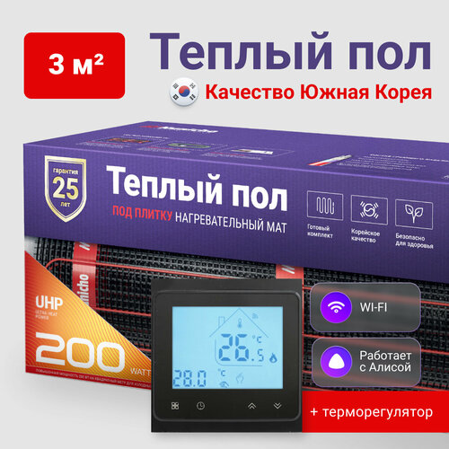 Купить Теплый пол электрический под плитку 3 м2 Nunicho 200 Вт/м2 с Wifi терморегулятором черным, нагревательный мат с доставкой по всей России.