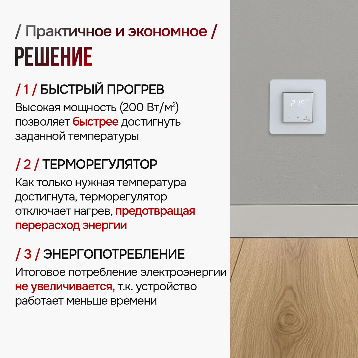 | Дополнительная информация | Умный терморегулятор OZ для управления теплым полом через смартфон или компьютер. Первый российский терморегулятор с геозонированием! Удаленное управление с помощью фирменного приложения Приложение доступно в GooglePlay и AppStore, также есть браузерная версия. Геозонирование или geo-fence (Geofencing) Уникальная функция в приложении Welrok экономит деньги благодаря автоматическому снижению нагрева, когда дома никого нет. После активации функции геозонирования, терморегулятор будет учитывать геолокацию всех пользователей, которым был предоставлен доступ. Когда вы выйдете за выбранный радиус, Welrok уменьшит или отключит обогрев в зависимости от выставленных настроек. Когда вы вернетесь в выбранный радиус, терморегулятор установит комфортную температуру. Недельное расписание и функция «Отъезд» Настраивайте комфортное расписание обогрева на день или неделю в приложении Welrok. Можно выбрать до 16 температурных периодов на каждый день. Отдельно можно задать температурный режим на время отъезда – отключить или уменьшить обогрев – и активировать его одним кликом, когда это необходимо. Подробная статистика потребления в кВт-часах и валюте Приложение предоставляет информацию о расходе электроэнергии в наглядных графиках, это помогает оптимизировать затраты. Добавьте свой тарифный план, чтобы видеть потребление в деньгах. Приложение позволяет выбрать двойной и тройной тарифы на электроэнергию. Голосовое управление Меняйте температуру нагрева и настройки терморегулятора с помощью Алисы от Яндекс и Маруси от ВК. Управление по локальной сети Меняйте настройки, используя локальную сеть, когда нет доступа к интернету. Интеграции Wi-Fi терморегуляторы можно интегрировать с вашей системой Умный дом через MQTT и http API. Совместим с рамками: Линейка Unica от Schneider Electric: Unica Basic, Unica Colors, Unica Quadro, Unica Plus, Unica Top, Unica Class, Unica New Unica studio. Внутренний размер лицевой панели без рамки 45*45мм. |