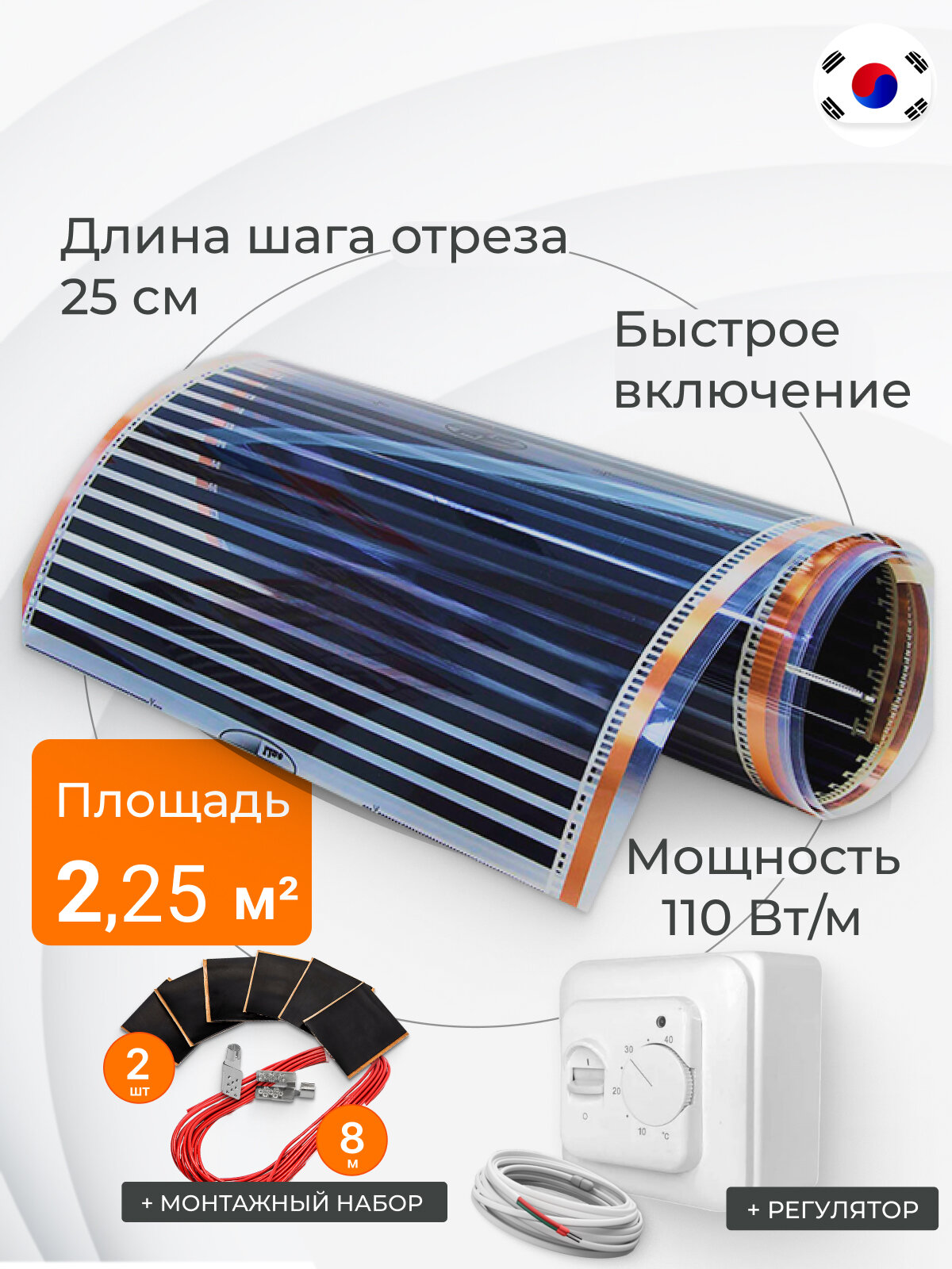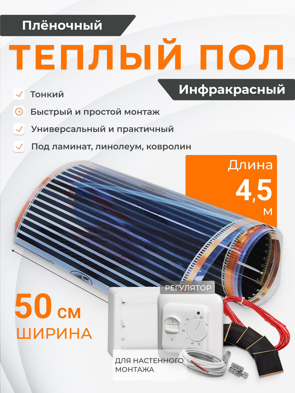 Купить Теплый пол пленочный инфракрасный 2.25 м2, длина 4.5 м, ширина 50 см, комплект, монтажный набор и регулятор с доставкой по всей России. Теплый пол пленочный инфракрасный 2.25 м2, длина 4.5 м, ширина 50 см, комплект, монтажный набор и регулятор: сравнение цен, характеристики, фото, актуальное наличие и цены.