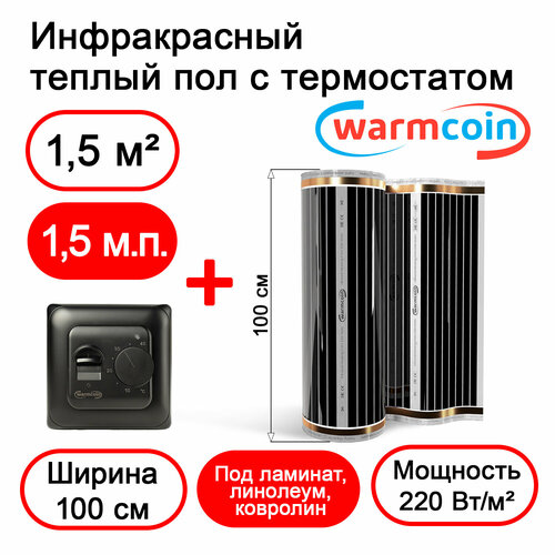 Купить Теплый пол Warmcoin инфракрасный 100см, 220 Вт/м. кв. с черным механическим терморегулятором, 1,5 м. п с доставкой по всей России.