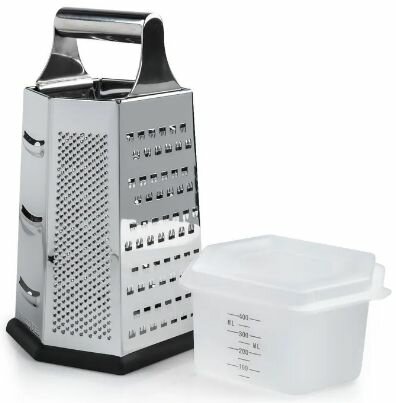 Терка TalleR TR-21906 с контейнером (старый артикул TR-1906) Размеры: высота - 22,9 см, основание 10,5 х 10,5 см. Большая площадь рабочей поверхности. 6 лезвий: крупная терка, средняя терка, мелкая терка, шинковка, фигурная шинковка, шредер. Съемный контейнер с крышкой обеспечивает порядок на рабочем пространстве и предохраняет продукты от обветривания. Специальная форма контейнера позволяет легко убирать его внутрь основания. Силиконовые протекторы на основании контейнера предотвращают скольжение даже на влажной поверхности. Можно мыть в посудомоечной машине.
