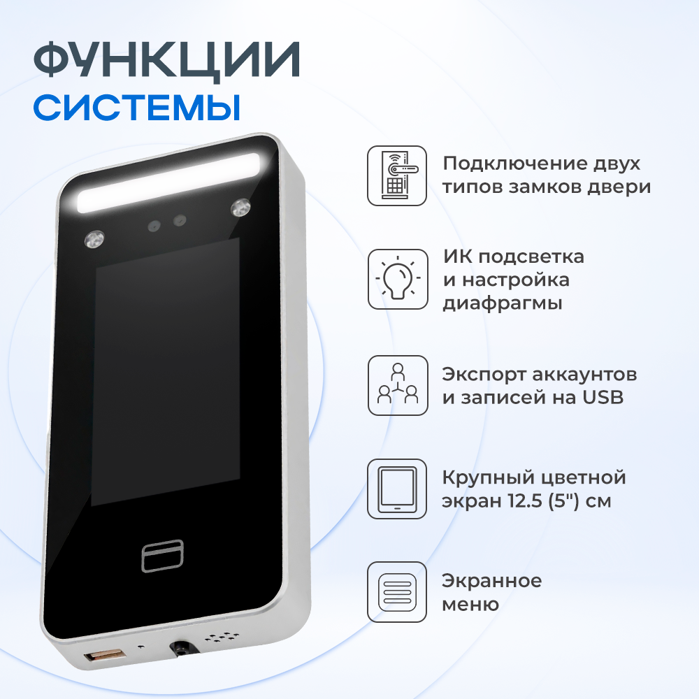 Встроенная видеокамера высокого разрешения эффективно распознают попытку обмана. Другими словами, устройство безошибочно определит реального человека, даже в случае наличия перед объективами бумажной фотографии или экрана телефона. Это позволит избежать фальсификаций и незаконных попыток входа. Также терминал обеспечен алгоритмами анализа пользователей в масках, с отображением целеуказателя на экране и имени пользователя. Кроме того, в помощь администратору создан режим импорта/экспорта учетных данных через USB носитель, хранение которых происходит во встроенной памяти емкостью 5гигабайт.