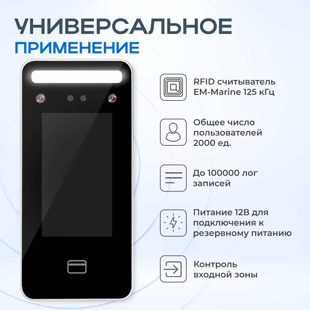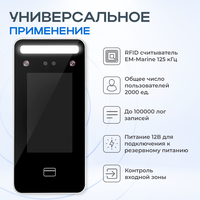 Терминал отличается от аналогов возможностью подключения к Wi-Fi сети объекта и удалённым доступом. В приложении администраторы видят историю авторизаций разными способами. Благодаря возможности хранить информацию о 2000 пользователей и экспортировать журнал посещений, устройство идеально подходит для компаний с большим числом сотрудников или посетителей, работающих в режиме 24/7.
