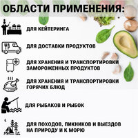 Крышка имеет плотный прижим, дополнительно может быть укомплектован ручками для переноса (продается отдельно); максимальная нагрузка: 50 кг; принцип охлаждения: требуется аккумулятор охлаждения