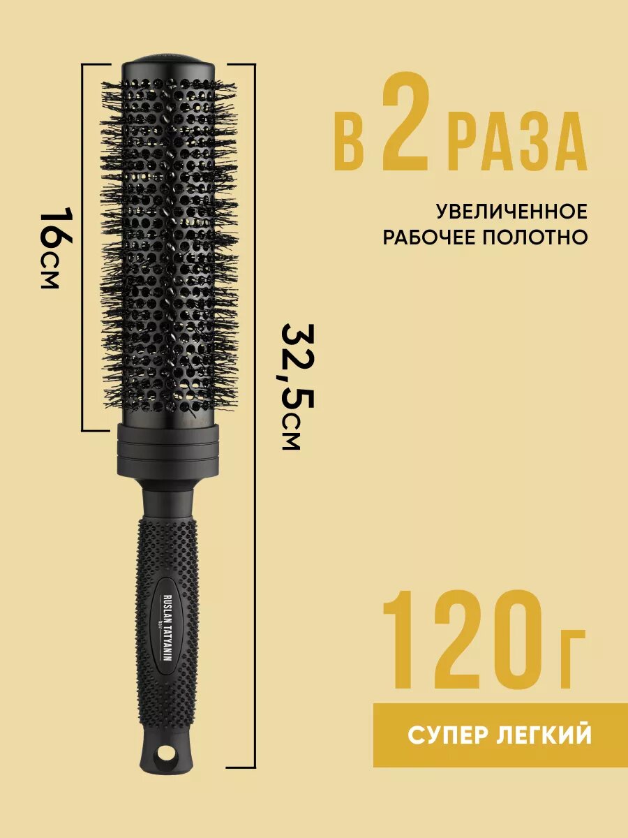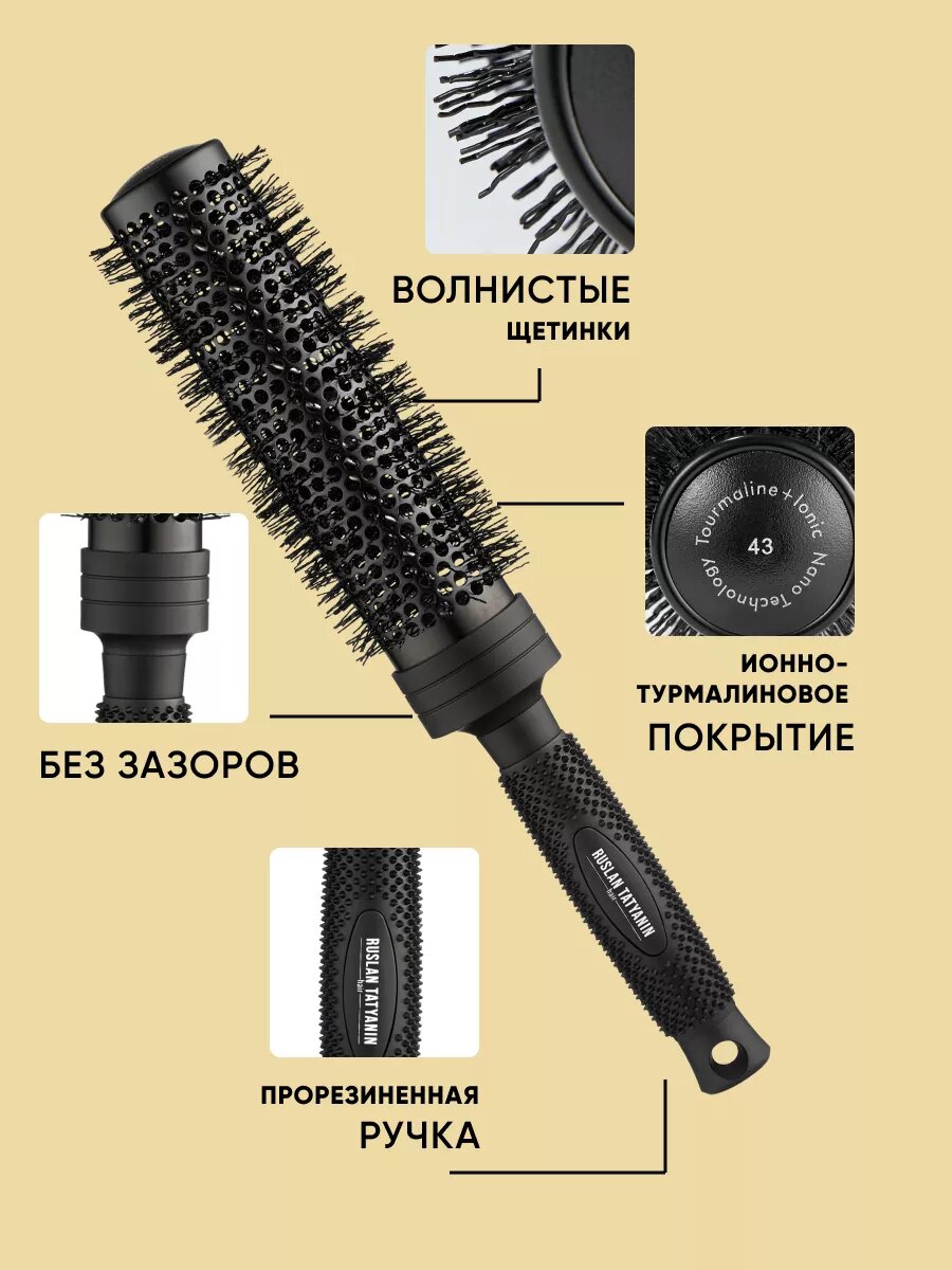 Представляем профессиональный брашинг для волос с турмалиновым покрытием рабочей части, меняющий цвет от бренда Руслан Татьянин - подходящий для укладки и ухода за волосами. При нагревании щетки до 60°C черное основание меняет цвет на белый. Таким образом, можно регулировать степень нагрева во избежание повреждения волос. Антистатические и ионно-заряженные нейлоновые волнистые щетинки эффективно предотвращают электризацию волос и даёт возможность прорабатывать даже самые тонкие волосы. Диаметр 43 мм подходит для длинных волос. Круглая расческа для укладки волос - незаменимый инструмент для парикмахеров и женщин, которые ценят и дорожат красивыми и здоровыми волосами. Продувной брашинг подходит для увеличения прикорневого объёма, создания прически, для ежедневной легкой, бережной и комфортной укладки феном. Термобрашинг для волос с удлиненным полотном обеспечивает легкое и комфортное расчесывание, придавая необходимый объем и форму. Изготовлена из высококачественных материалов. Эта туннельнаярасческа хорошо подходит для всех типов, включая кудрявые и вьющиеся, волнистые и прямые, нарощенные и тонкие волосы. Она справляется как с влажным, мокрыми так и сухими, придающих им потрясающий вид и блеск. С помощью нашего термо брашинга вы сможете легко создать различные прически - от выпрямления до создания объемного стайлинга или элегантной челки. Так же является отличным средством для стимулирования роста волос и заботы о них. Благодаря удобной форме и эргономичной и не скользящей ручке, использование этой щетки становится простым и комфортным процессом. Она легко помещается в сумку или косметичку, что делает ее аксессуаром для поездок и путешествий. Неотъемлемый инструмент профессионала парикмахера или любителя хорошего стиля, наш профессиональный женская круглый брашинг гарантирует уход и стайлинг волос. Инструмент нового поколения - Попробуйте сегодня и почувствуйте разницу с первого применения