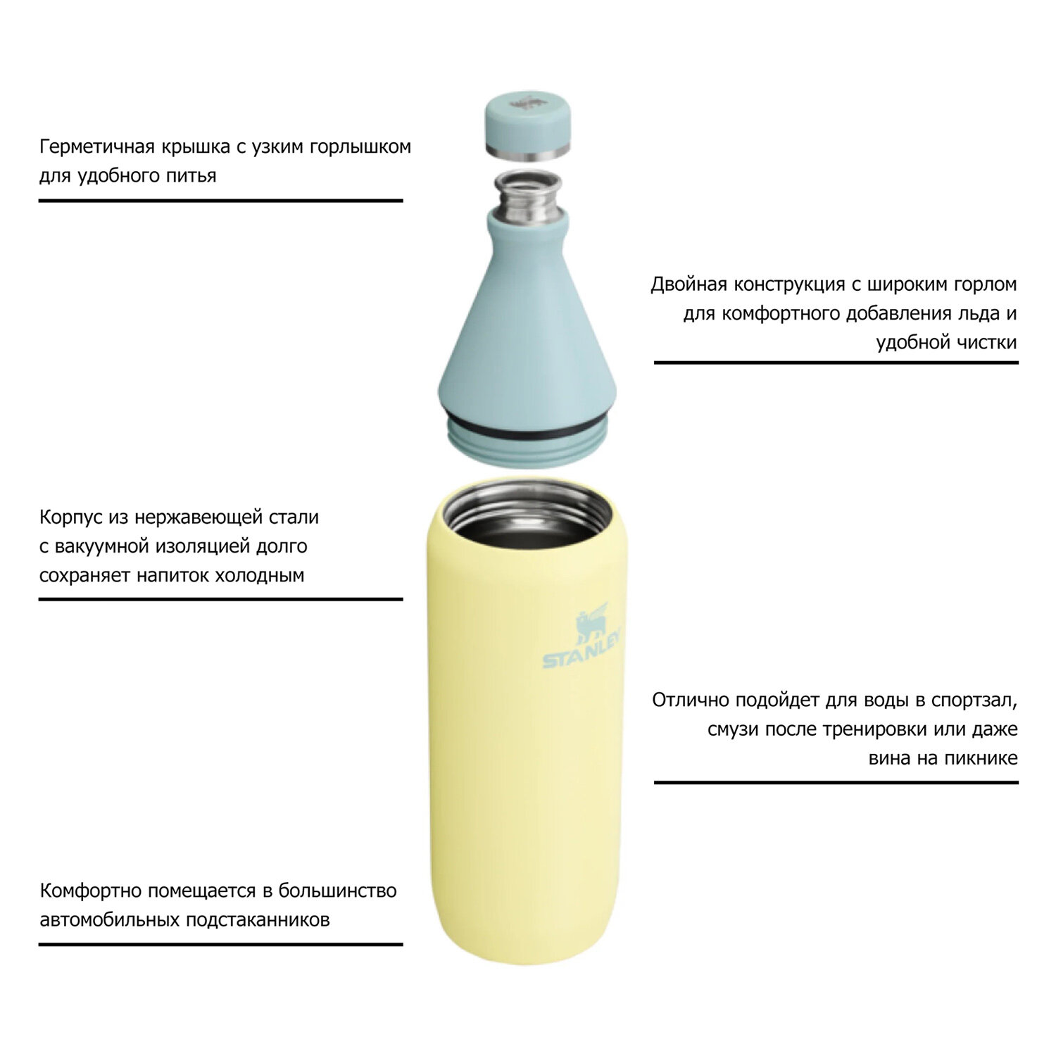 Дизайн бутылки дополнен гравировкой логотипа Stanley, который эффектно выделяется на фоне перехода от глянцевой к матовой поверхности. Это делает термобутылку не только функциональным аксессуаром, но и стильным элементом образа. Кроме того, термобутылка совместима с большинством автомобильных подстаканников, что делает её удобной как в повседневной жизни, так и в поездке.