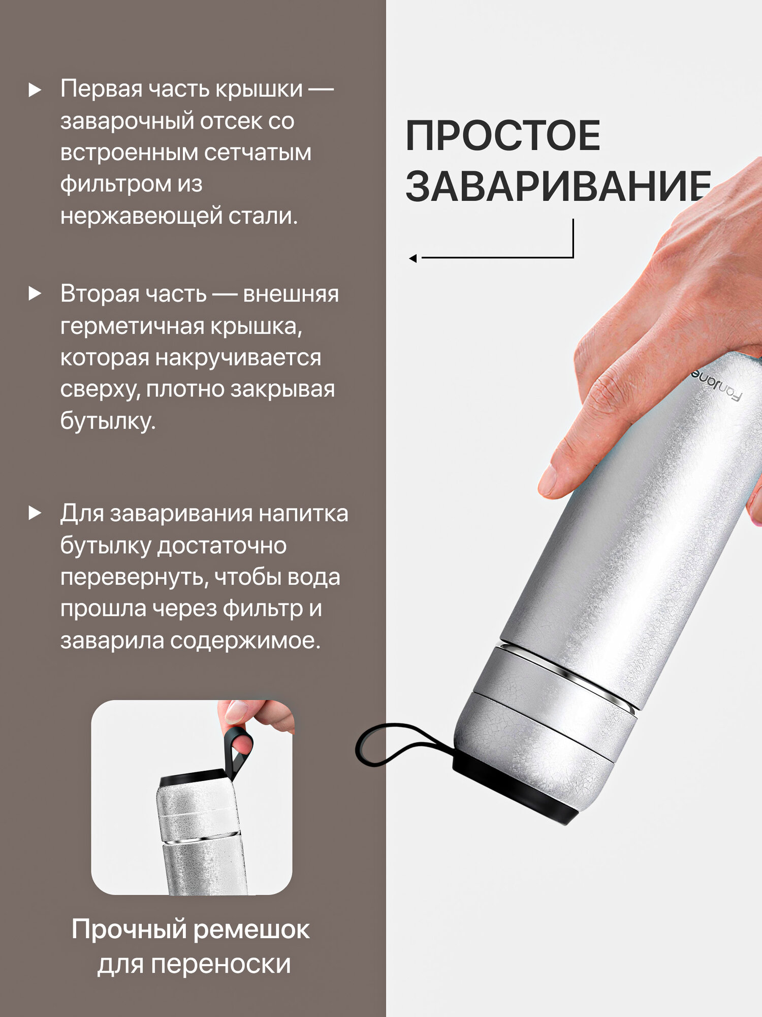 Для заваривания напитка бутылку достаточно перевернуть, чтобы вода прошла через фильтр и заварила содержимое.