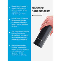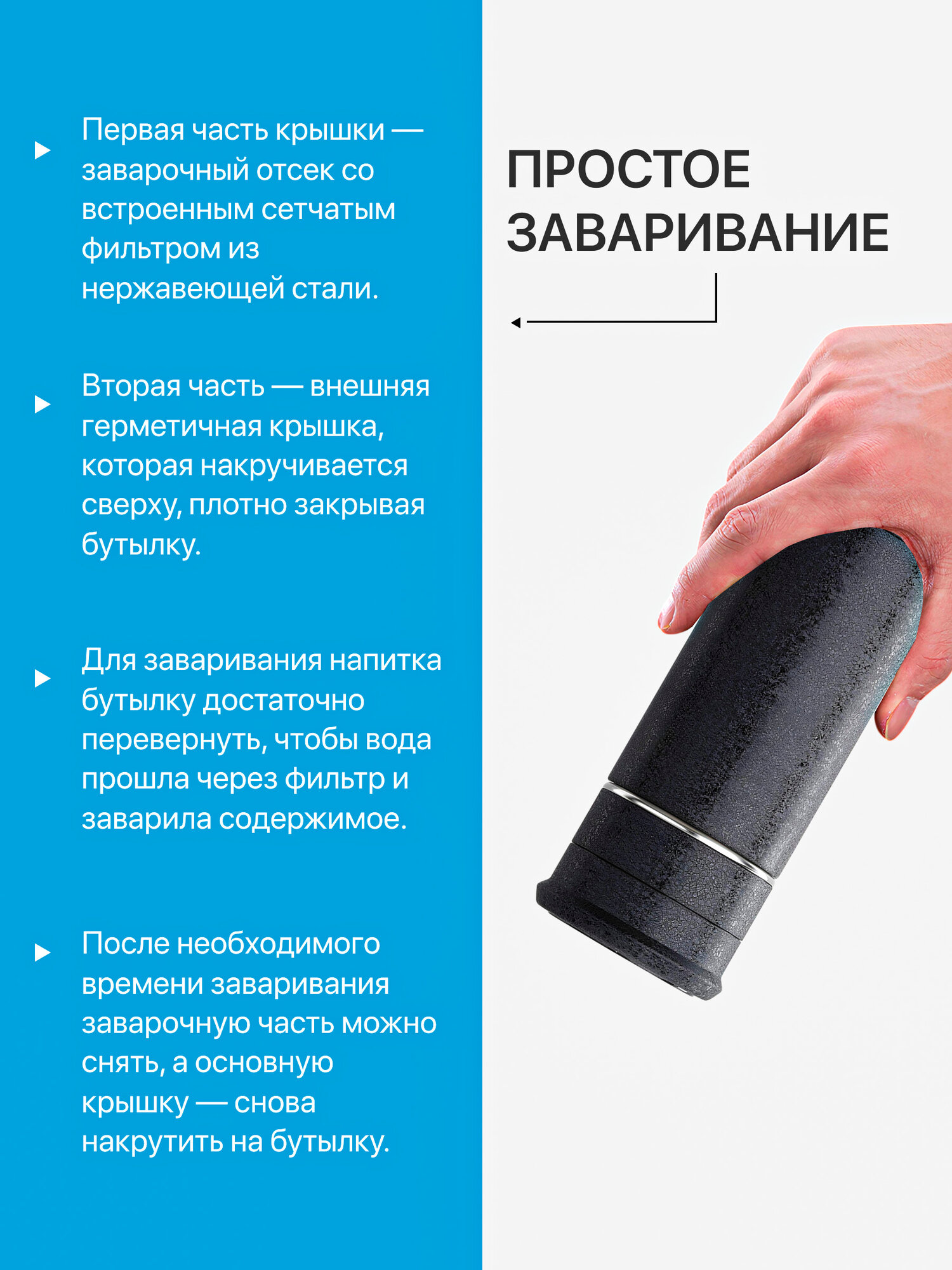 Для заваривания напитка бутылку достаточно перевернуть, чтобы вода прошла через фильтр и заварила содержимое.