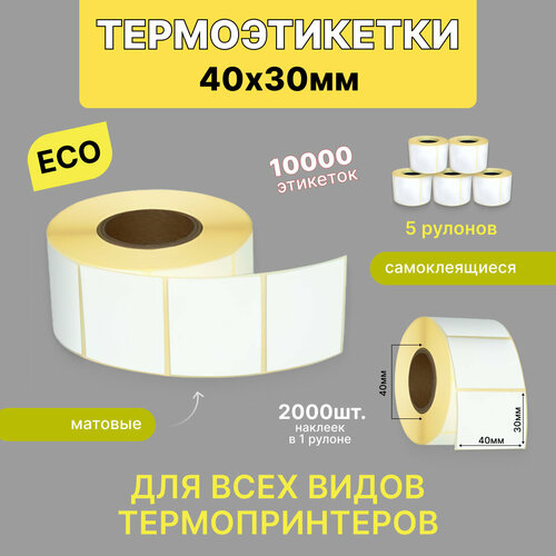 Размеры термоэтикеток 30 на 40 мм. В упаковке 5 рулонов. В 1 рулоне 2000 шт термонаклеек. Диаметр рулона 111 мм (+/- 3 мм)