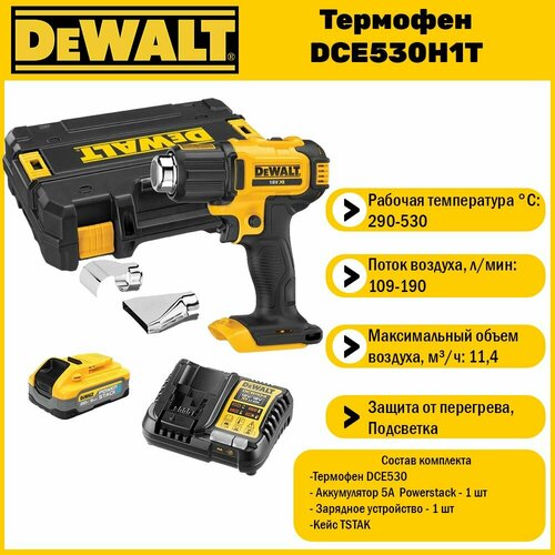 Термофен Dewalt DCE530H1T (1 АКБ 5 Ач Powerstack и ЗУ в кейсе TSTAK): сравнение цен, характеристики, фото, актуальное наличие и цены.