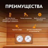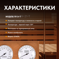 Термогигрометр оснащен биметаллическим термометром, который позволяет измерять температуру в диапазоне от 0 до +120°С. Это обеспечивает точное измерение температуры в парной, что важно для комфортного и безопасного пребывания в бане.