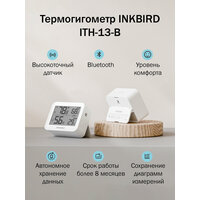 Термогигрометр INKBIRD ITH-13B, Bluetooth 5.0, 2 датчика температуры и влажности, логгер. Представляем Вам компактную и функциональную новинку 2025 года от компании INKBIRD! Термогигрометр идеален для контроля за влажностью и температурой как в Вашем доме, так и для работы, может выполнять множество различных сценариев для отслеживания микроклимата и его параметров. В комплекте поставки сразу 2 монитора, которые можно установить в разных помещениях, подключить же к одному смартфону. Bluetooth 5.0: Термогигрометр INKBIRD ITH-13B работает по протоколу Bluetooth 5.0, который позволяет контролировать температуру и влажность воздуха в помещении с помощью смартфона. Вы можете удаленно следить за изменениями микроклимата в помещении на расстоянии до 40 метров, что существенно облегчает контроль. Швейцарский датчик: ITH-13B оснащен профессиональным высококлассным датчиком Sensirion, который поддерживает измерение в диапазоне температур от -20 до 60 °C с точностью 0,2°С и относительной влажности от 0% до 99% с точностью до 2%. Вы можете быть уверены в точности и своевременности измерений. Большой ЖК-экран с диагональю 5,8 см: На ЖК-экране четко отображаются текущая температура и влажность, максимальные/минимальные значения за последние 24 часа/48 часов/за все время, а также уровень комфортности воздуха в режиме реального времени. Специально разработанный индикатор уровня комфорта помогает Вам с легкостью оценить качество воздуха в помещении, а диапазон настроек определяется пользователем в приложении INKBIRD, что делает его исключительно удобным для быстрого считывания данных. 2 года хранения истории: Устройство ITH-13B может хранить данные автономно до 300 дней и автоматически загружает данные в приложение через Bluetooth-соединение, следя за тем, чтобы ни одна из записей не была потеряна. Интервал записи параметров можно изменить в приложении INKBIRD – пользователю доступны отрезки времени 1/2/5/10 минут. Исторические данные о температуре и влажности за период до 2 лет можно просмотреть на графике приложения и экспортировать на Ваш компьютер по электронной почте для дальнейшего подробного изучения качества воздуха в помещении. Для всего самого важного: Каждый ITH-13B работает непрерывно не менее 8 месяцев от 2 батареек типа ААА, входящих в комплект поставки, что позволяет в течение длительного времени регистрировать температуру и влажность со стабильным и точным определением. Благодаря своим компактным и портативным размерам ITH-13B можно подвесить или разместить в небольших сухих помещениях, таких как спальни, шкафы для музыкальных инструментов, террариумы для рептилий, винные шкафы, инкубаторы, коробки с травами и шкафы для ювелирных изделий. Спецификация Размеры датчика: 60*47*23 мм Протокол Bluetooth: 5.0 Дистанция подключения: до 40 метров на открытом пространстве Степень защиты от влаги и пыли: IP20 Модель датчика: Sensirion (пр-во Швейцария) Скорость измерения: 3 сек Диапазон рабочих температур: -20 до 60 °C Диапазон измерения влажности: от 0% до 99% Точность измерения температуры: 0,2 °С Точность измерения влажности: 2% Источник питания: 2*AAA Срок работы батареи: до 8 месяцев на комплектных элементах питания Интервал регистрации: 1/2/5/10 минут, по умолчанию - 1 минута, настраивается в приложении Автономное хранение данных: До 300 дней ( зависит от интервала регистрации)