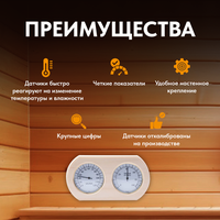 Термогигрометр оснащен биметаллическим термометром и волосным гигрометром, что позволяет измерять температуру в диапазоне от 0 до +120°C и влажность воздуха в парной.