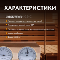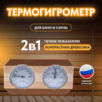 Термогигрометр ТН-22-C контраст форма очки - это прибор для измерения температуры и влажности воздуха в парной. Он изготовлен из комбинированной древесины и предназначен для настенного размещения.