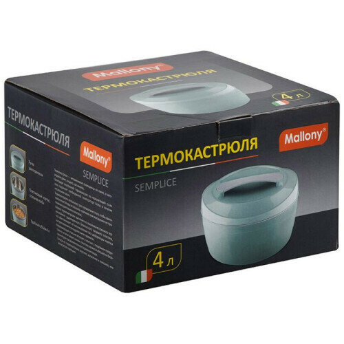 термокастрюля объемом 4 литра, выполнена из пластика, внутренняя часть из нержавеющей стали, сохраняет тепло до 6 часов, имеет ручку для удобного переноса