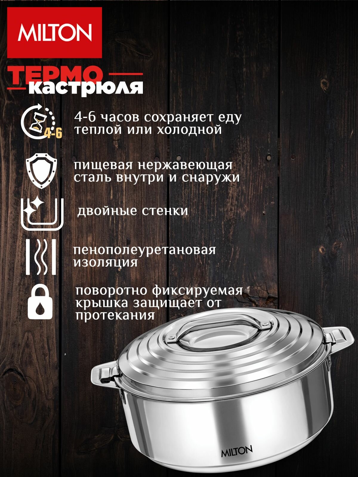 Корпус термокастрюли представляет собой термокапсулу из высококачественной безопасной пищевой нержавеющей стали, которая обеспечивает сохранность содержимого термокастрюли горячим или холодным в течение 4-6 часов. Термокастрюли используют для сервировки стола, чтобы приготовленные блюда оставались горячими или холодными на протяжении длительного застолья. Также термокастрюли очень востребованы детьми и людьми с ограниченными физическими возможностями, когда пища заблаговременно помещается в термокастрюли, а ко времени трапезы остается горячей, не требующей разогревания. Очень удобны термокастрюли для использования на пикнике, чтобы салаты оставались длительное время холодными, а блюда, запеченные на углях, оставались горячими. Корпуса термокастрюль выполнены из ударопрочной нержавеющей стали, что обеспечивает их использование без деформации корпуса на протяжении очень длительного времени. Нержавеющая сталь не вступает в контакт с пищевыми продуктами и не впитывает запаха, поэтому является абсолютно безопасной для продолжительного хранения пищи. Термокастрюли экологически чистые и безопасные, они сделают вашу жизнь проще!