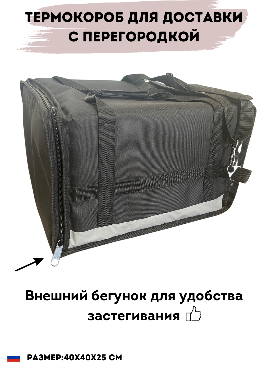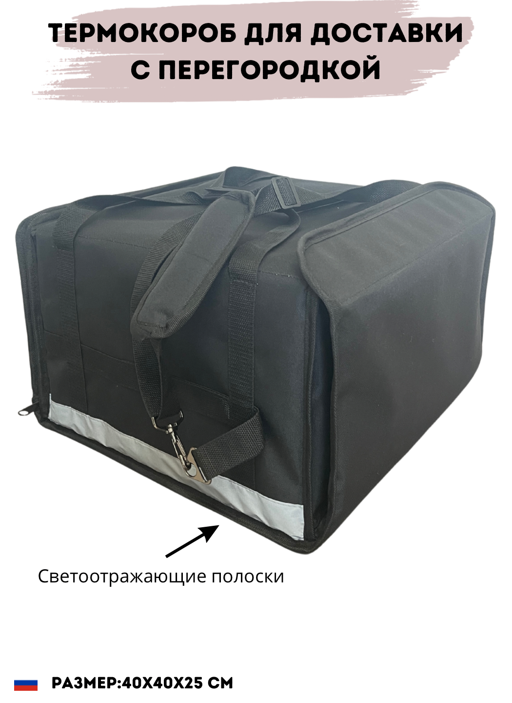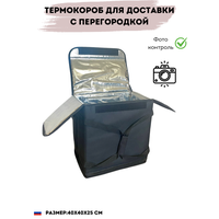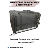 Проходит фотоконтроль моментально 100% Новый в упаковке(в сложенном виде) Непромокаемый материал, что позволяет использовать термокороб во время дождя и снега и не переживать, что содержимое внутри может испортиться Подходит для любого вида доставки(на машине, велосипеде или пешком) В комплекте внутренние перегородки для еды, стаканчиков кофе и бутылок(крепко фиксируют) Боковой карман(можно положить что-то не крупное из продуктов, либо документы) Стандартный размер 40х40х25