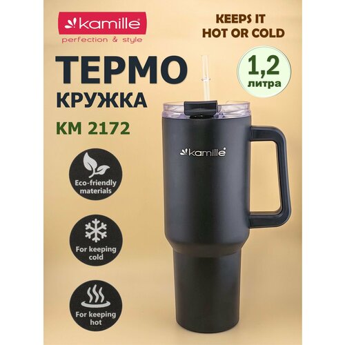- максимально большой объем 1200 мл и трубочка в комплекте, расширяют возможности использования термокружки;