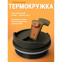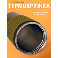 Мужская термокружка из металла сохраняет тепло и герметична. Крышка обеспечивает безопасность, предотвращая случайное открытие в сумке.