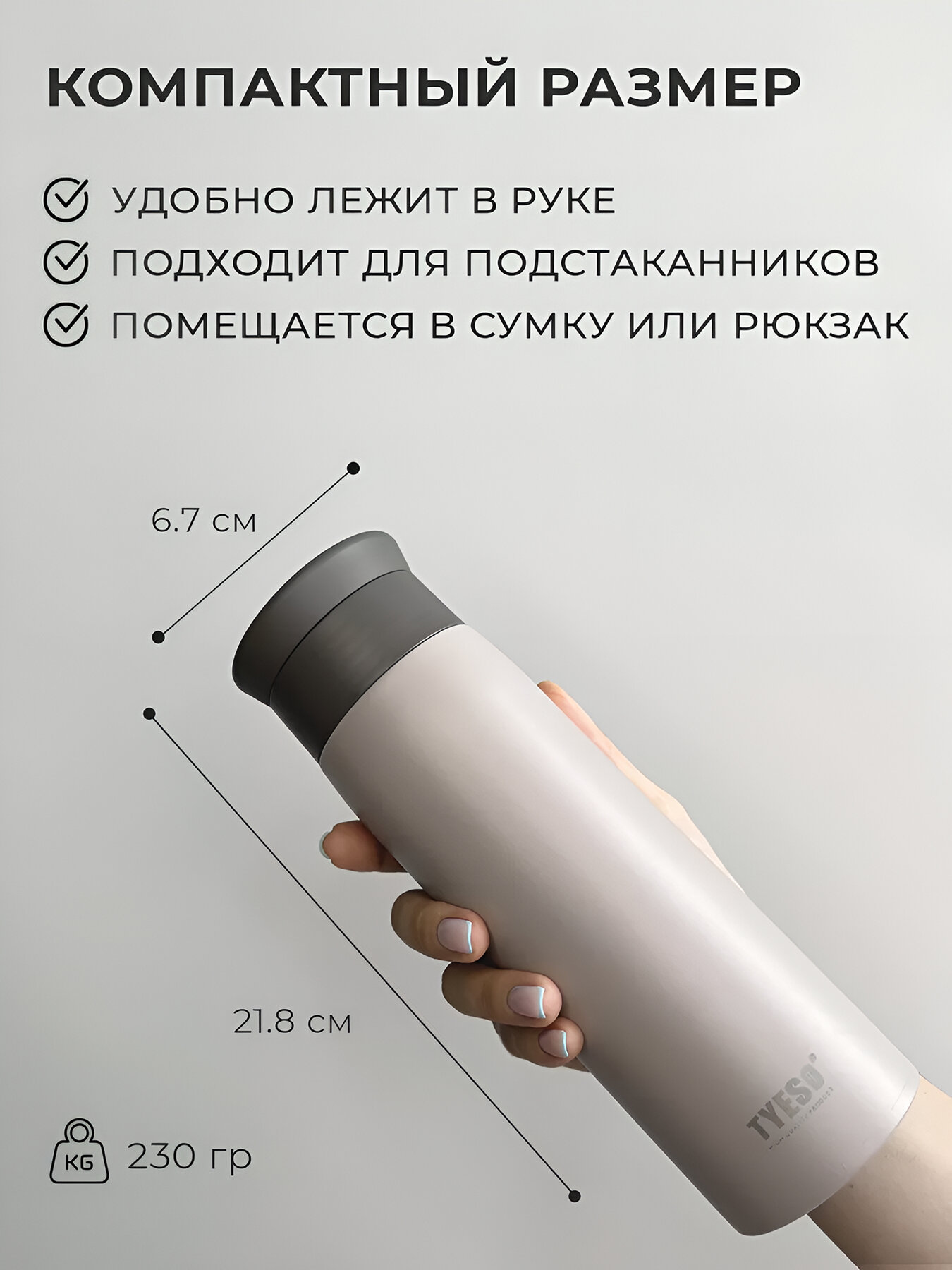 Представляем вам уникальную термокружку для чая и кофе объемом 500 мл. Эта кружка термос сделана из высококачественной нержавеющей стали и имеет двойную стенку, что обеспечивает долгое сохранение температуры внутри. Небольшой объем кружки термоса 0.5 л позволяет заваривать вкусный кофе или чай в правильных пропорциях, и использовать ее как автомобильную термокружку. Термокружка выполнена в минималистичном дизайне и компактна в размере. Она подходит для любых подстаканников, помещается в сумку и рюкзак, что делает ее идеальным спутником в поездках, на работе или в университете. Стакан термос с горлом и фильтром сохраняет тепло до 30 часов, а холод до 48 часов, благодаря двойным стенкам и вакуумной изоляции в колбе и крышке. Для наилучшего эффекта налейте в термос термокружку кипяток или холодную жидкость перед использованием. Не забудьте открыть термокружку после того, как нальете горячий напиток, чтобы выпустить пар. Термос из нержавейки можно мыть только руками и нельзя помещать в микроволновую печь. Термокружка для чая и кофе объемом 500 мл - это идеальное решение для тех, кто ценит комфорт и функциональность. Закажите нашу термокружку прямо сейчас и наслаждайтесь горячими напитками в любое время дня и в любом месте!