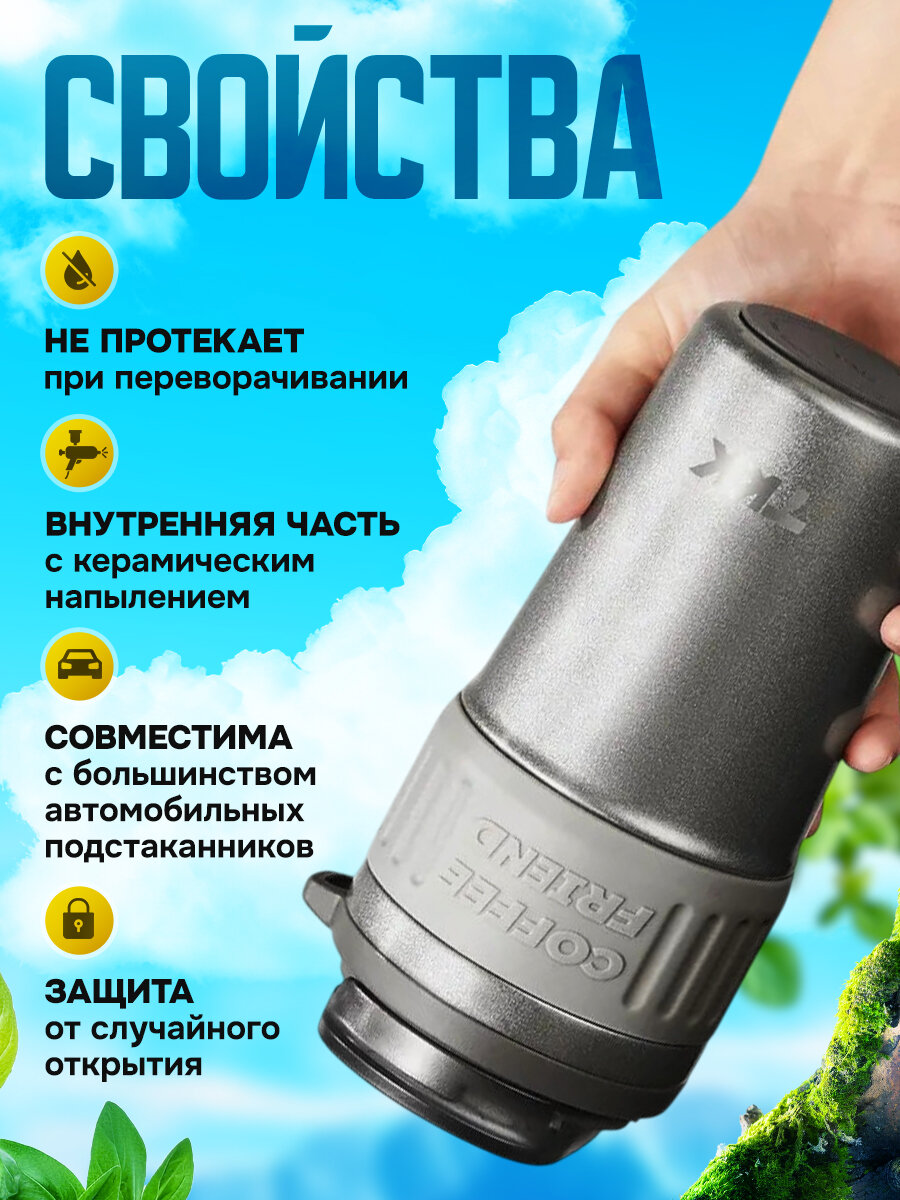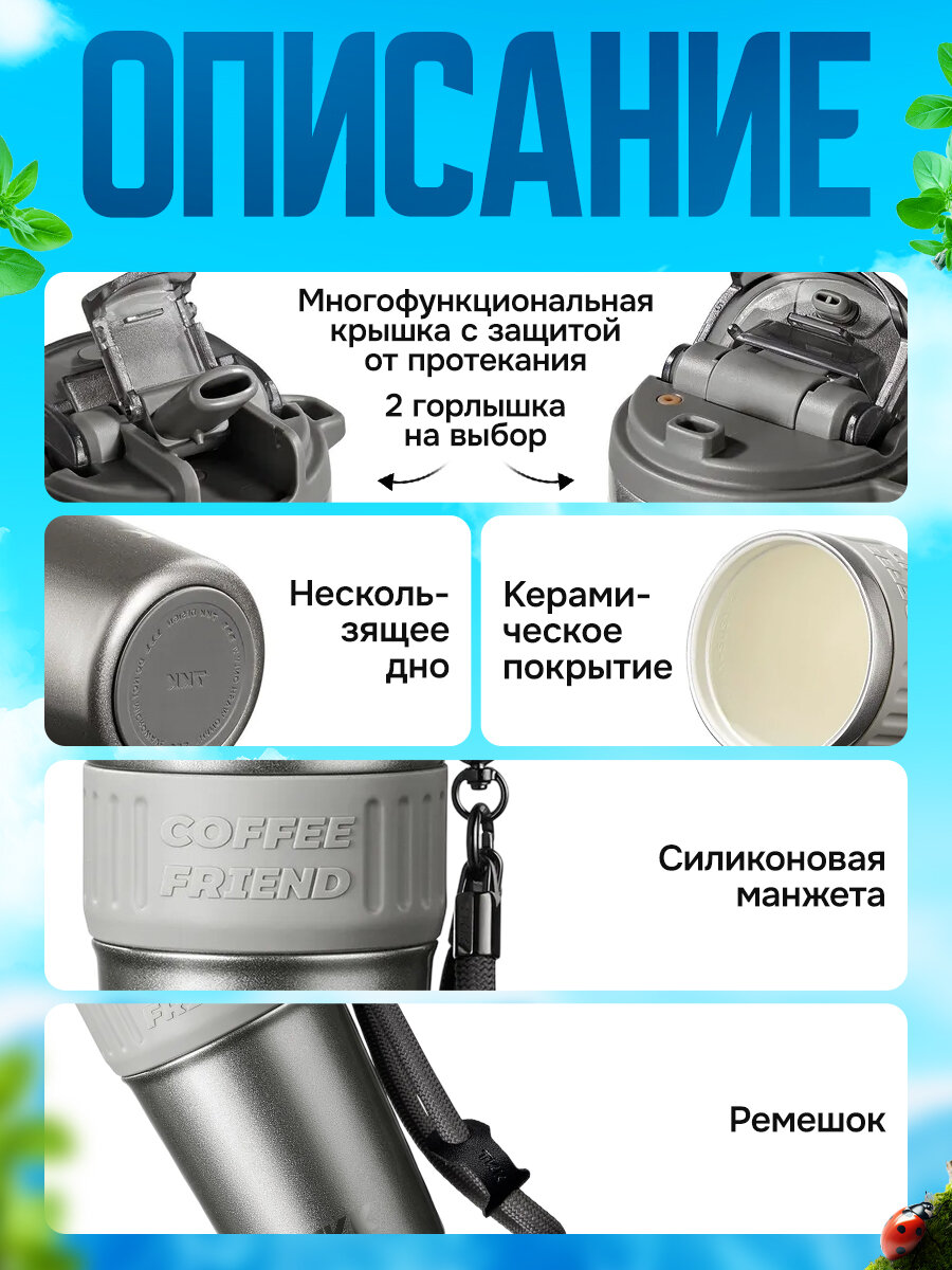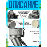 | Особенности | кнопка-клапан, непроливайка, нескользящее дно, отверстие для питья в крышке, ремень для переноски, ручка на корпусе, с ситечком, силиконовая вставка на корпусе |