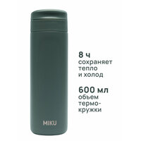 Термокружка MIKU с крышкой объемом 600 мл сохраняет температуру горячих и холодных напитков до 8 часов. Благодаря этому может быть заменой небольшим городским термосам свыше 500 мл. Станет стильным подарком для любителей чая или кофе. Разные цвета моделей позволяют подобрать подходящий вариант и для мужчин, и для женщин.