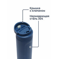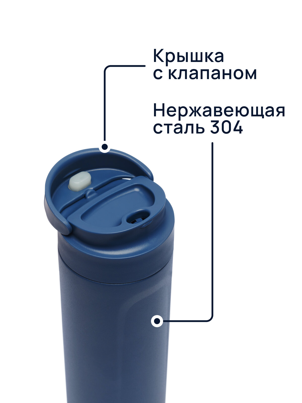 Термостакан сделан из пищевой нержавеющей стали. Стенки — двойные, с вакуумной изоляцией. Герметичная крышка-клапан закручивается и сидит плотно, а надежный клапан не даст любимому напитку пролиться.