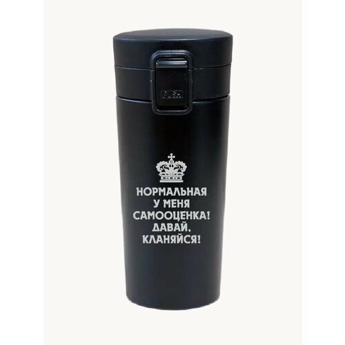 Стильная термокружка "Нормальная у меня самооценка, давай кланяйся!" объемом 380 мл. - прекрасный подарок мужу, другу, жене, подруге. Основная часть термокружки с принтом изготовлена из нержавеющей стали и имеет двойные стенки, что позволяет надолго сохранять температуру напитка. Крышка термостакана выполнена из качественного пищевого пластика, обеспечивает герметичное закрытие и фиксацию, защищая от случайного вскрытия. Мини термос идеален для горячих и холодных напитков. Термокружка с надписью подходит для заваривания чая, кофе и других напитков прямо в кружке, т. к. имеет ситечко. Термос кружка не меняет вкус напитка, не впитывает запахи, не ржавеет. Универсальная термокружка (городская, походная) имеет компактный размер и отлично помещается в любой подстаканник: автомобиль, велосипед, детская коляска. Кружка термос прекрасно подойдет в качестве подарка: на День рождения, на Новый год, на 8 марта и на 23 февраля. Термо кружка для кофе/чая с антискользящим дном имеет красивый и стильный дизайн. Надпись на термокружке выполнена лазерной гравировкой, которая не сотрется со временем. Термокружка - это идеальный подарок для мамы, папы, начальника, коллеги или даже подруги. Будь то юбилей, 8 марта. А еще, она подходит для мужа, брата, сестры, тещи, тестя, свата, снохи, свекра, свекрови, крестной или крестного. Благодаря инновационной технологии, она сохраняет тепло в течение целых 8 часов. И если вы предпочитаете холодные напитки, то не волнуйтесь, также она сохранит их холодными в течение 12 часов. Одно из главных преимуществ этой термокружки - ее удобная и надежная крышка с блокировкой. Крышка плотно закрывается и фиксируется, что обеспечивает максимальную защиту от проливов, сохраняя ваше вкусное питание или любимый напиток в полной сохранности. Эта термокружка универсальна и подойдет для любого повода - от дня рождения до годовщины свадьбы, от подарка для девочки до подарка для учителя.
