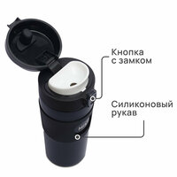 Термостакан сделан из пищевой нержавеющей стали 304. Крышка — герметичная, открывается одним нажатием на кнопку и фиксируется на замок. Двойные стенки — с вакуумной изоляцией. Чай и кофе можно заваривать прямо в кружке — в крышку встроено ситечко ситечко.