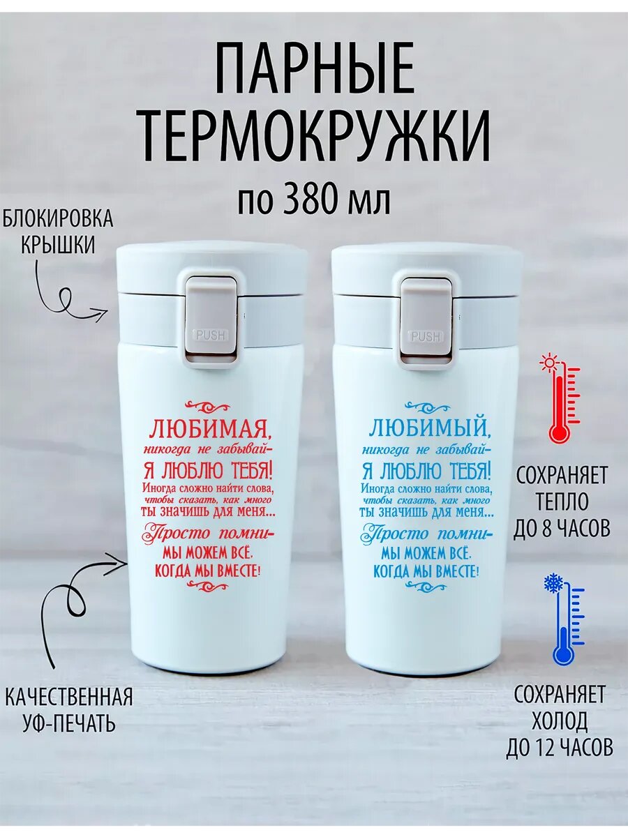 Парные термокружки — стильный и практичный подарок для вас и ваших близких в современной жизни! Парные термокружки — это стильный и практичный набор из двух идентичных термокружек, созданных специально для двоих. Каждая кружка выполнена из высококачественной нержавеющей стали с двойными стенками, что обеспечивает отличную термоизоляцию и долговечность использования. Благодаря объему 380 мл, они вмещают достаточное количество напитка.