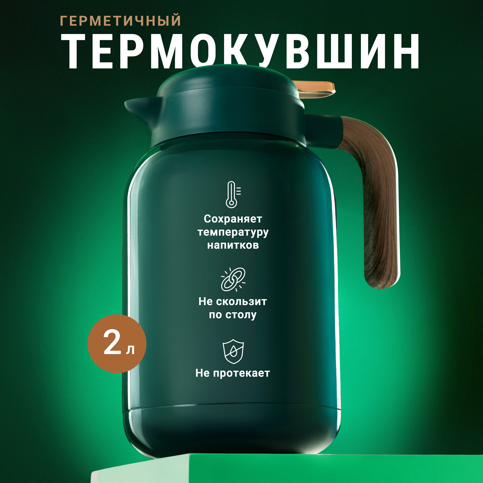 Стильный герметичный термокувшин объемом 2 л от бренда 2SA станет украшением вашего стола. Он выполнен из высококачественных материалов, надолго сохраняет температуру напитков и не проливается. Элегантное сочетание цветов и материалов пользоволяет вписать термокувшин в любой дизайнерский интрерьер. С утра за завтраком, днем во время быстрого перекуса или после сытного ужина в семейном кругу — в любой из этих ситуаций термокувшин 2SA позволяет быстро насладиться любимым горячим чаем или кофе. Если вы предпочитаете прохладительные напитки, то термокувшин прекрасно сохраняет и их температуру: достаточно добавить в напиток немного пищевого льда. Прочная внутренняя колба из нержавеющей стали обеспечивает сохранение температуры напитка до 24 часов. Благодаря герметичной крышке, напиток не только сохраняет температуру на протяжении всего дня, но и не проливается. Удобная деревянная ручка не скользит в руке, а анатомическая клавиша клапана позволяет пользоваться кувшином одной рукой: достаточно прижать её большим пальцем и напиток можно наливать. Емкость термокувшина в 2000 мл позволяет использовать термос как для личного, так и для семейного использования. Легкий и компактный дизайн делает его удобным в использовании и транспортировке. Термокувшин отлично подойдёт в качестве подарка на 14 февраля, 23 февраля и 8 марта. Термос-кувшин герметичный зелёный объемом 2000 мл от 2SA – это отличный выбор для тех, кто ведет здоровый образ жизни и ищет надежное решение для хранения напитков!