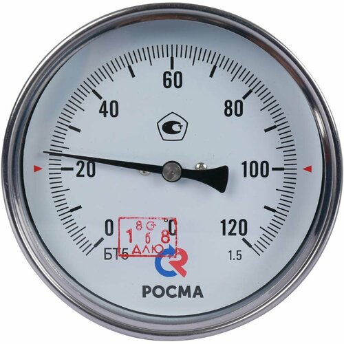 Биметаллический термометр Росма БТ-51.211 100/100 (арт. 00000002539) с размером крепления 1/2", диаметром 100 мм, диапазоном показаний от 0°С до +120°С и классом точности 1,5 снабжён погружной гильзой размером 100x6 мм.