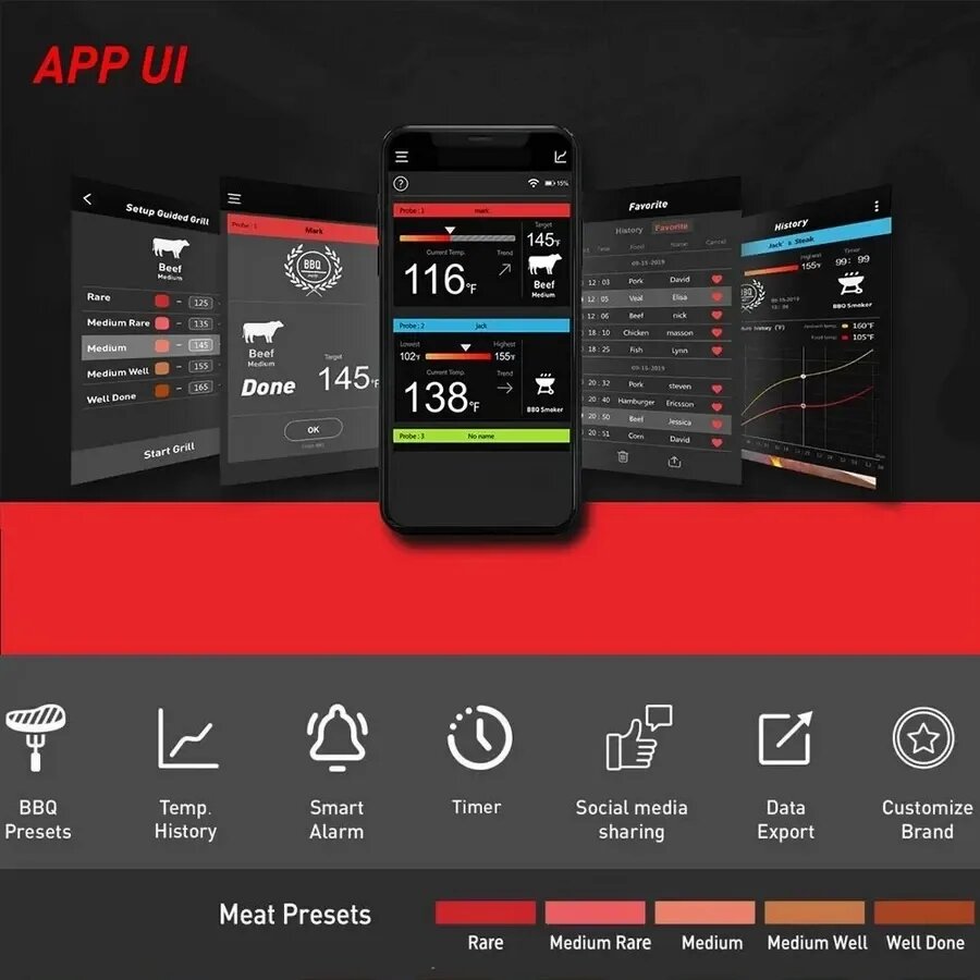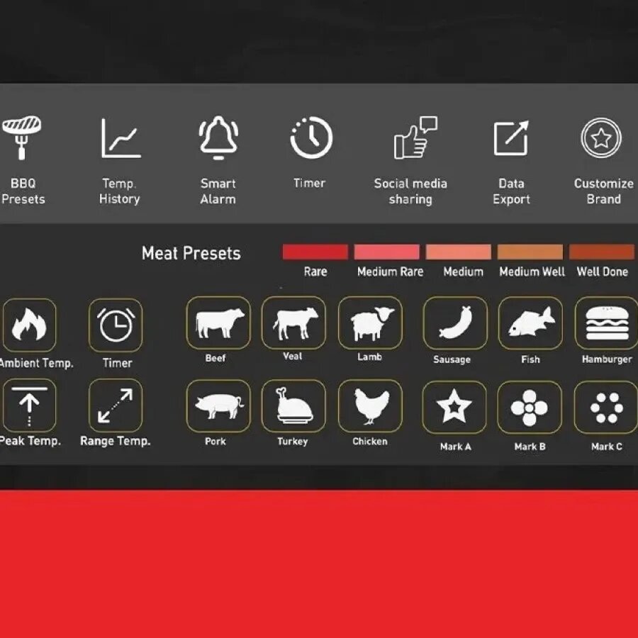 Профессиональный инструмент для гриллинга, обеспечивающий абсолютный контроль температуры при приготовлении мяса. Четырехканальная система позволяет одновременно отслеживать температуру до четырех стейков и самой решетки гриля.