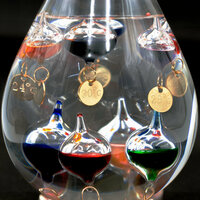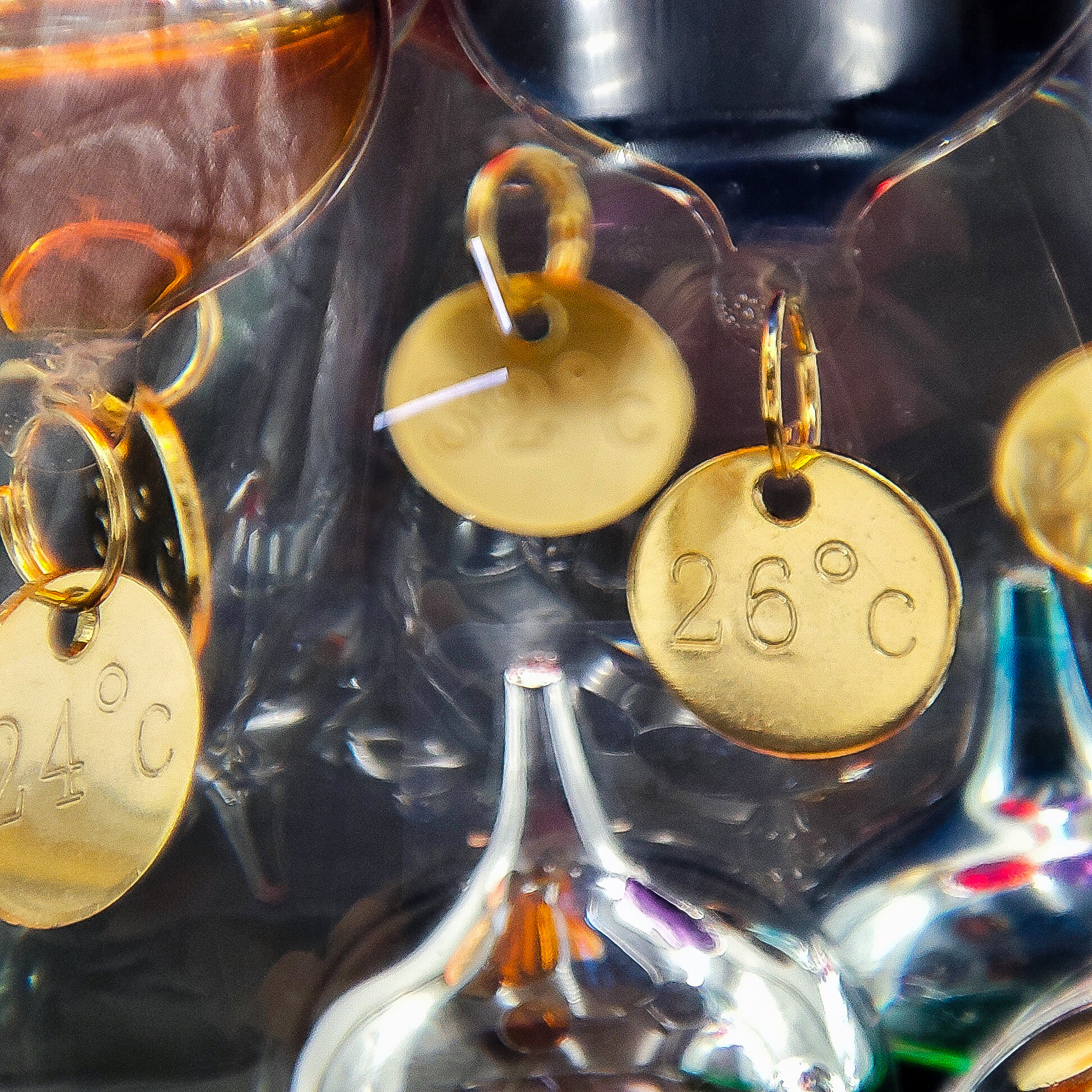 В зависимости от температуры окружающей среды шарики либо опускаются в сосуде, либо поднимаются. К шарикам прикреплены бирочки с указанием температуры. Данное изделие имеет 10 шаров и диапазон измеряемых температур от 16 до 34 градусов Цельсия.