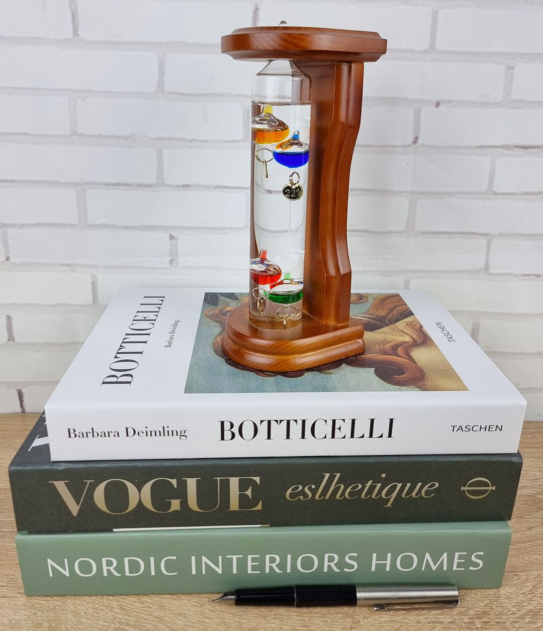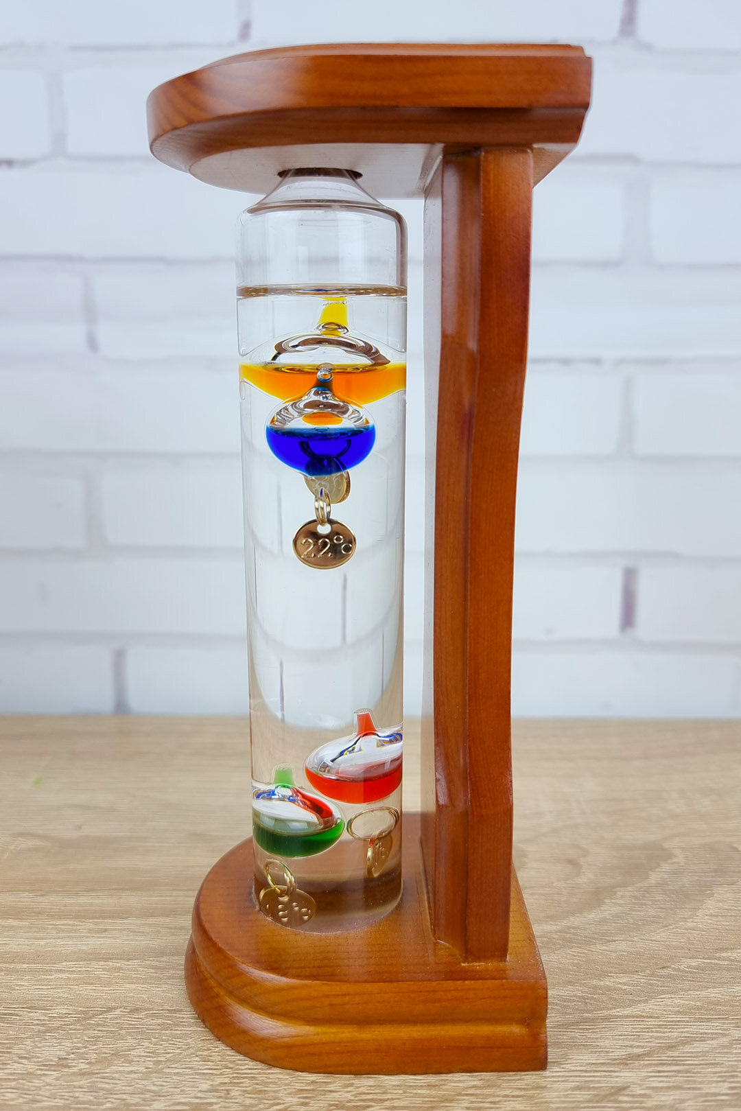 Стекло и дерево Термометр Галилео Капля , настольный 18x7x7см Ищите подарок для любознательного человека у которого все есть? Тогда термометр Галилея для Вас. Им можно измерить температуру в помещении средневековым методом. Название его происходит от имени итальянского физика Галилео Галилея, который в 16 веке изобрел термоскоп, ставший прообразом всех современных термометров. Термометр Галилео -это колба запаянная снаружи, а внутри нее- вода. В воде плавают поплавки с указателями температуры. Поплавки по-разному наполнены жидкостью таким образом, что их средняя плотность различна. При понижении температуры в помещении плотность жидкости в цилиндре увеличивается и шарики поднимаются вверх один за другим, при повышении — опускаются. Диапазон измерения температуры от 18 до 26 градусов. Шар который находится ниже всех и будет указывать температуру в помещении. Термометр Галилея - отличный подарок и оригинальный предмет интерьера.