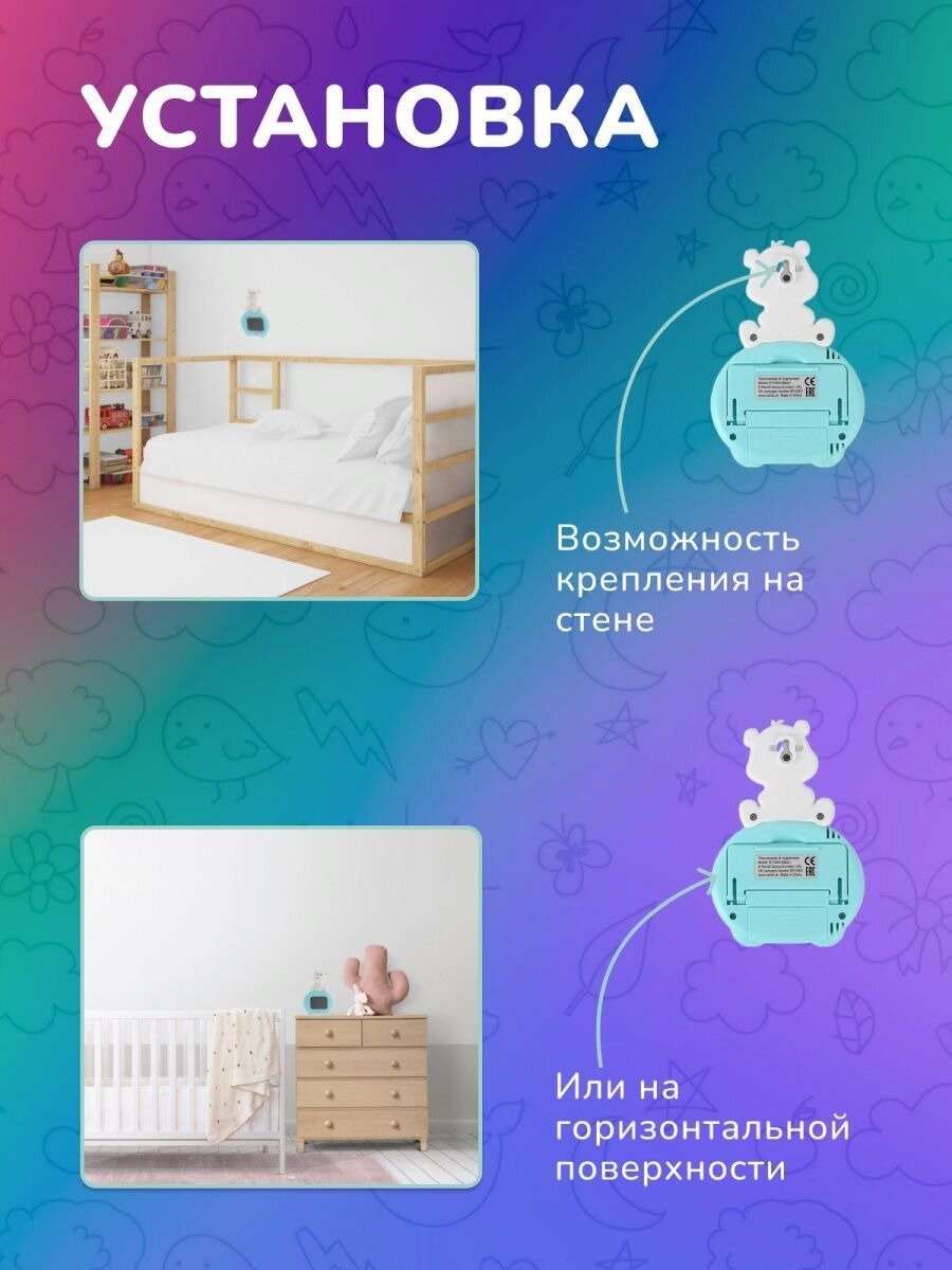 На экране отображаются значения температуры и относительной влажности в детской комнате. 3 типа анимированных изображений на экране характеризуют уровень комфорта в помещении (с точки зрения температуры и относительной влажности воздуха): комфортно, допустимо, не комфортно. Устанавливается на горизонтальной поверхности или крепится на стене. Привлекательный для ребенка дизайн – мишка. Диапазоны температуры и влажности