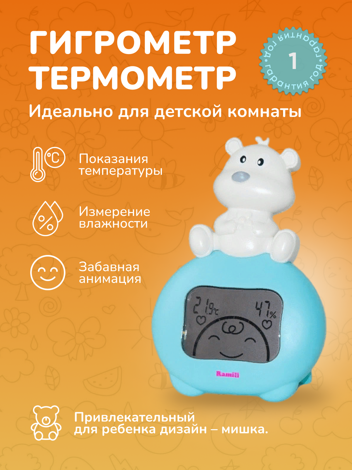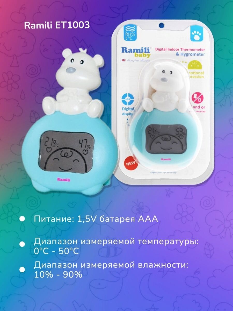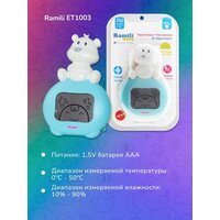 Гигрометр-термометр от известного производителя детских товаров Ramili предназначен для измерения температуры и относительной влажности воздуха в детской комнате. Данные отображаются на LCD-дисплее в виде цифровых значений в сопровождении с забавной анимацией.