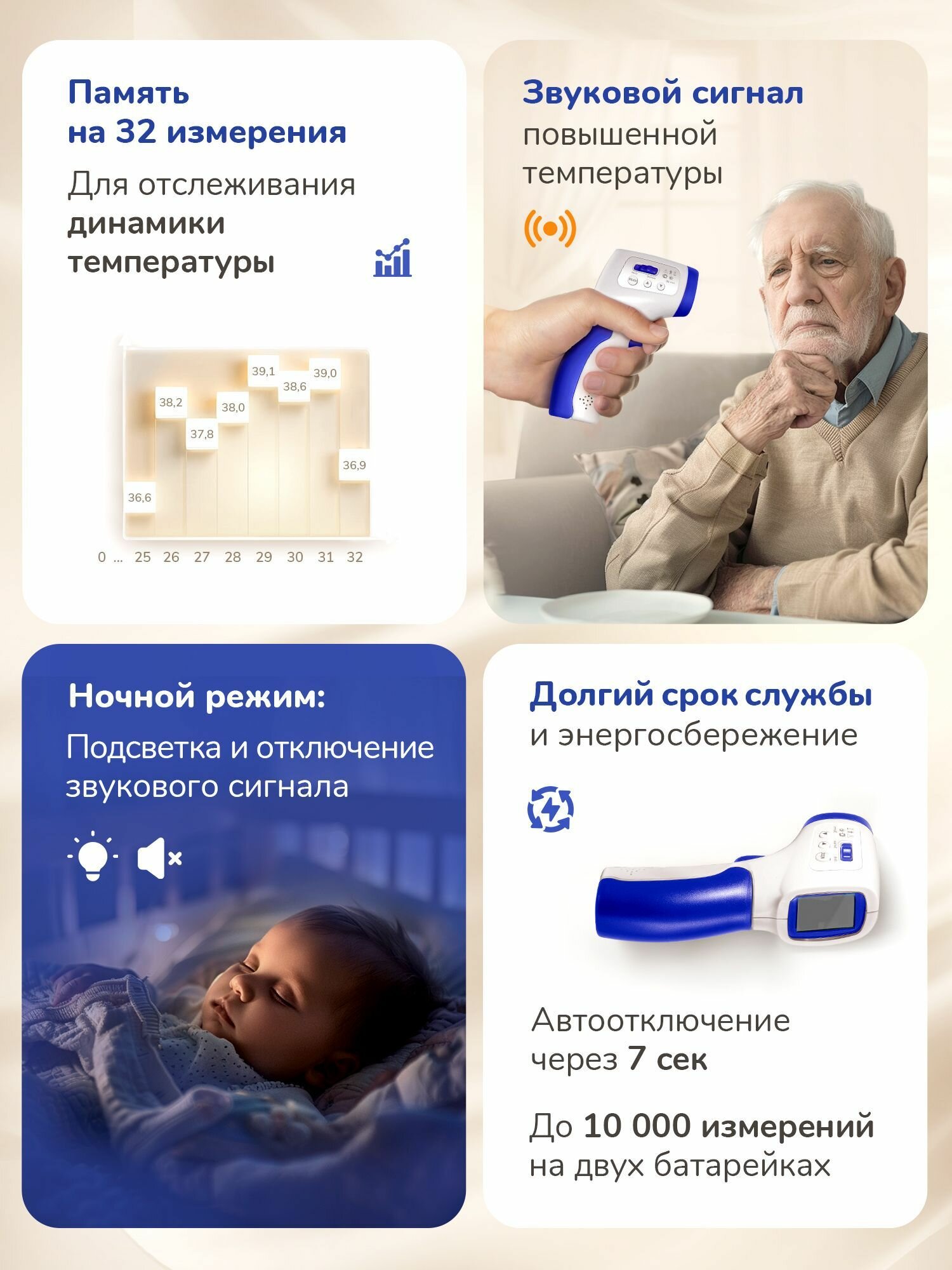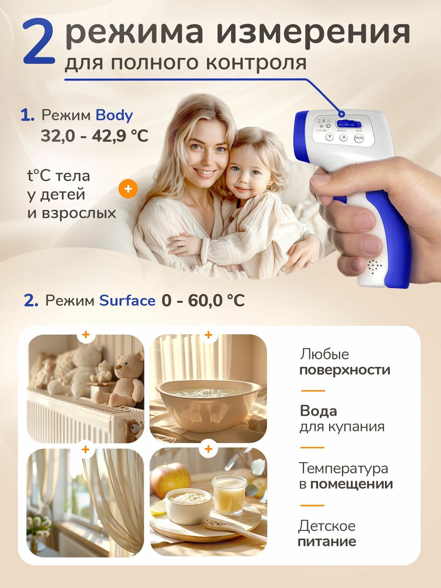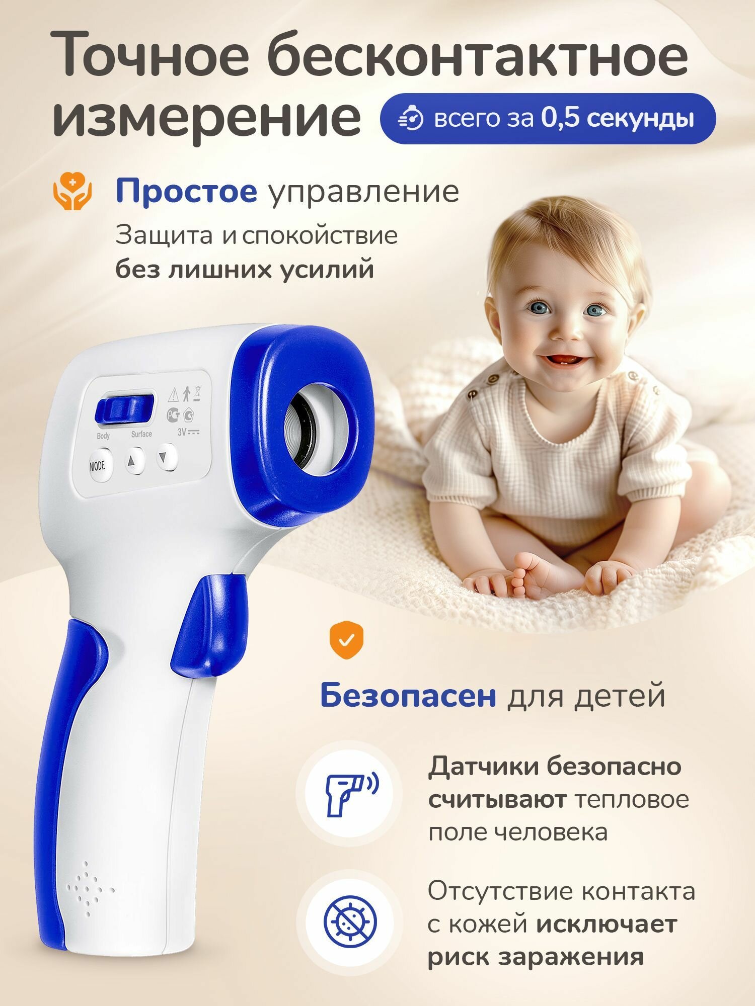 Экономит время. Не нужно ждать ни 10, ни 5, ни даже 1 минуты, чтобы узнать температуру заболевшего члена семьи и начать своевременное и адекватное лечение. Результат отображается уже через половину секунды; Не нуждается в дезинфекции после каждого измерения. Это особенно важно, если нужно мерить температуру нескольким членам семьи или пациентам в палате; Позволяет измерить температуру отдельных частей тела (учтите, что показания могут значительно различаться для открытых и закрытых участков).