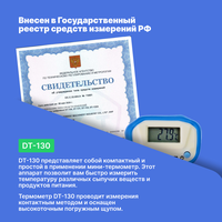 DT-130 представляет собой компактный и простой в применении мини-термометр. Этот аппарат позволит вам быстро измерить температуру различных сыпучих веществ и продуктов питания. Термометр DT-130 проводит измерения контактным методом и оснащен высокоточным погружным щупом. Контактный щуп DT-130 легко поддается очистке и не требует особых условий эксплуатации.