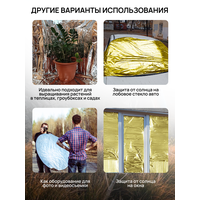 Серебристый цвет напыления с одной стороны задерживает потерю тепла, а золотистый цвет с другой стороны отражает тепло, обеспечивая защиту от перегрева.