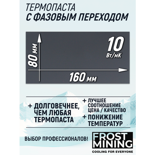 Термопрокладка с фазовым переходом от FrostMining - представляет собой материал с фазовым переходом (PCM) со сверхвысокой теплопроводностью в виде термопрокладки. При толщине 0,2мм растекается по поверхности тонким слоем толщиной до 17 микрон, полностью заполняя зазоры контактных поверхностей.