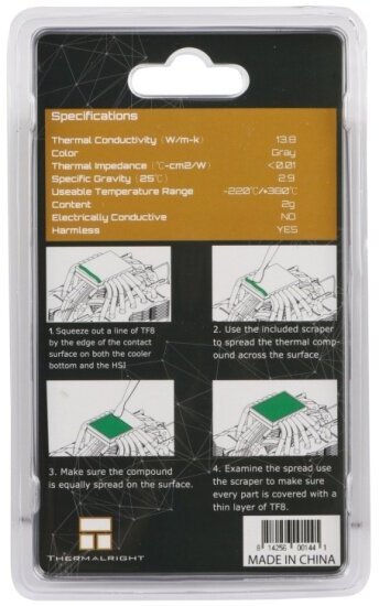 Термопаста Thermalright TF8 представляет собой высокопроизводительное решение для использования в игровых и рабочих системах. Благодаря первоклассному составу, не содержащему проводящие ток компоненты, данная смесь отличается высокой надежностью и теплопроводностью, соответствующей 13.8 Вт/мК, что отлично подойдет для самых разных процессоров, в том числе, и разогнанных. Благодаря данной термопасте можно значительно повысить температуру и обеспечить высокую частоту работы чипа в течение длительного времени. Помимо этого смесь отличается однородной структурой и при нанесении обеспечивает равномерный слой, заполняющий все микропоры поверхности процессора, что положительно сказывается на эффективности отвода тепла.Термопаста Thermalright TF8 поставляется в удобном шприце, вмещающим в себя 2 г смеси нейтрального серого цвета. Для аккуратного и равномерного нанесения в комплекте поставки предусмотрена пластиковая лопатка.