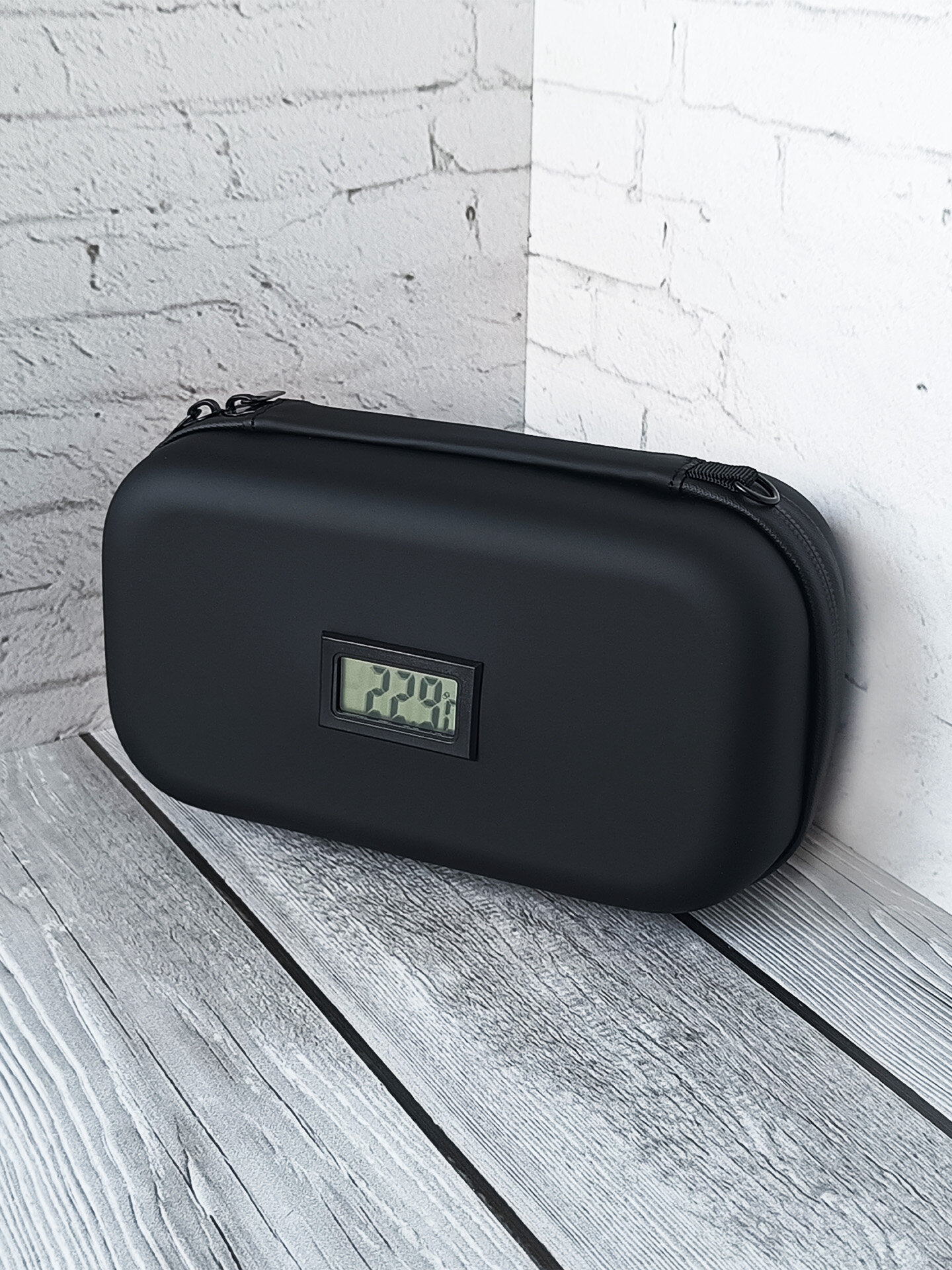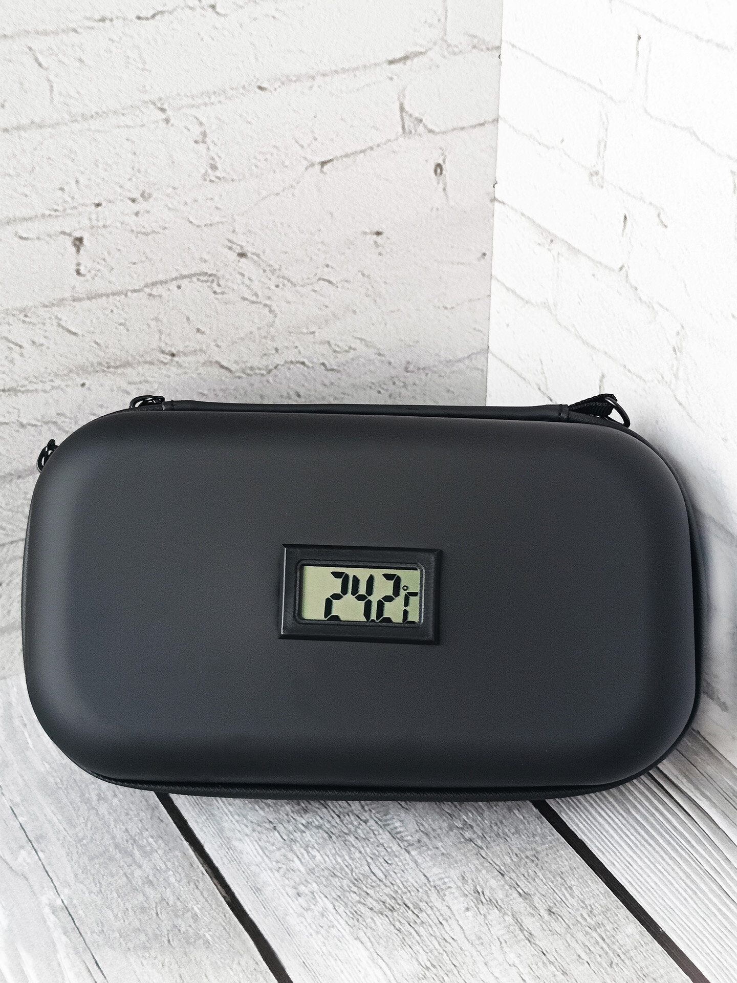 Особенность состоит в том, что на корпусе кейса для лекарств есть табло которое показывает температуру.