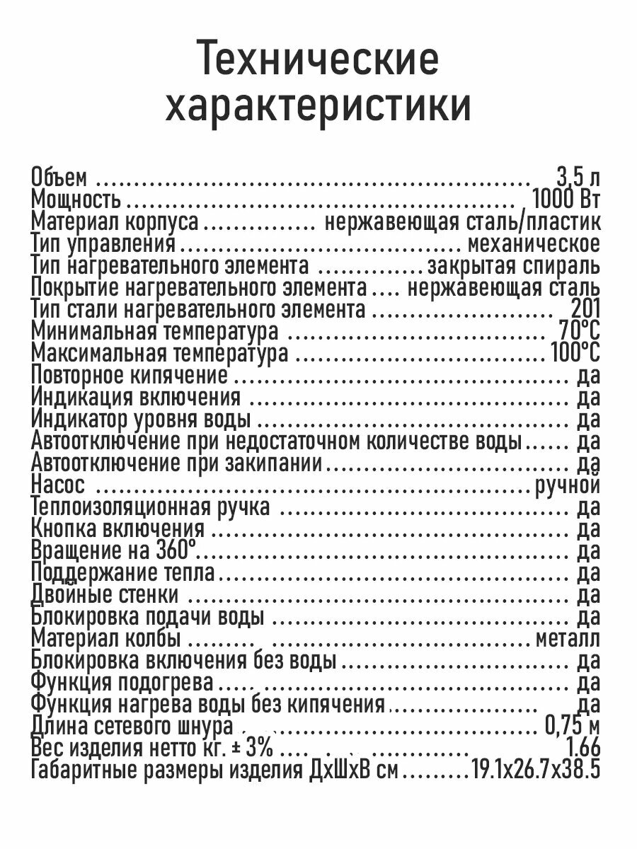 | Дополнительные функции | длительное кипячение, поддержание температуры |