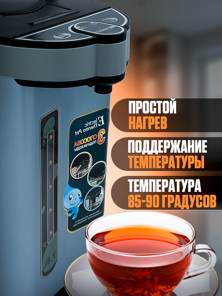 Он оснащен вместительной колбой из нержавеющей стали объемом 7 литров, что позволяет надолго сохранить ваши напитки горячими. Этот термопот обладает температурными режимами, что дает возможность выбрать оптимальный нагрев воды для различных целей.