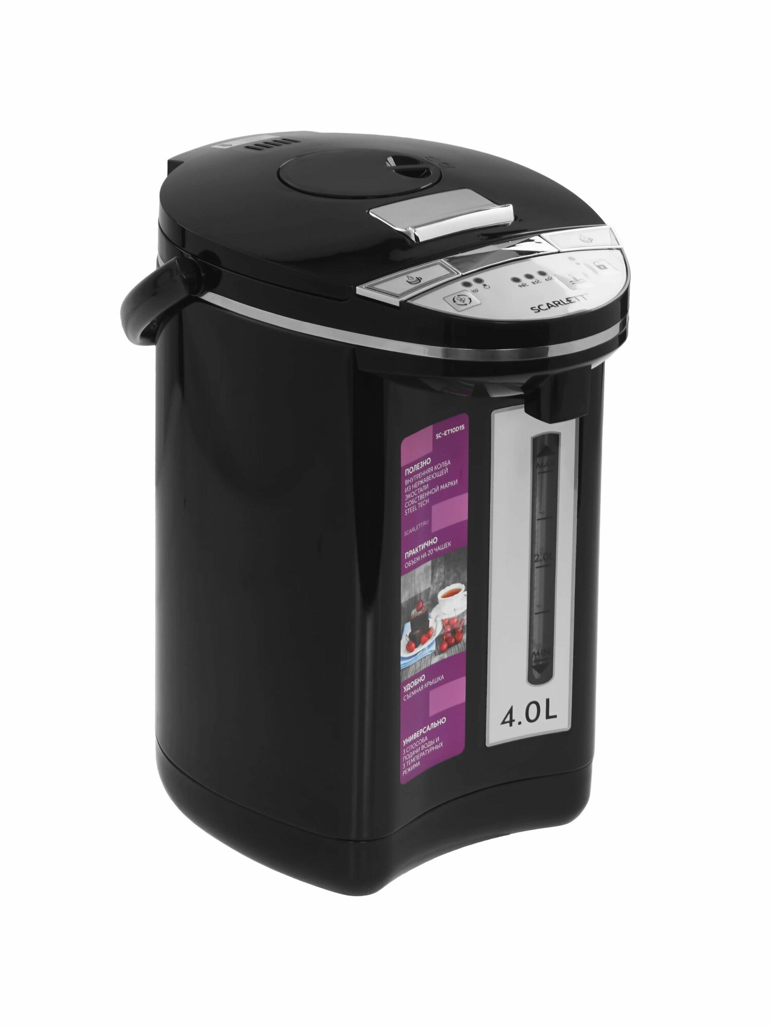 Термопот электрический Scarlett SC-ET10D15, Объем 4л, Три температурных режима, Эко-сталь повышенной прочности, Черный: сравнение цен, характеристики, фото, актуальное наличие и цены.