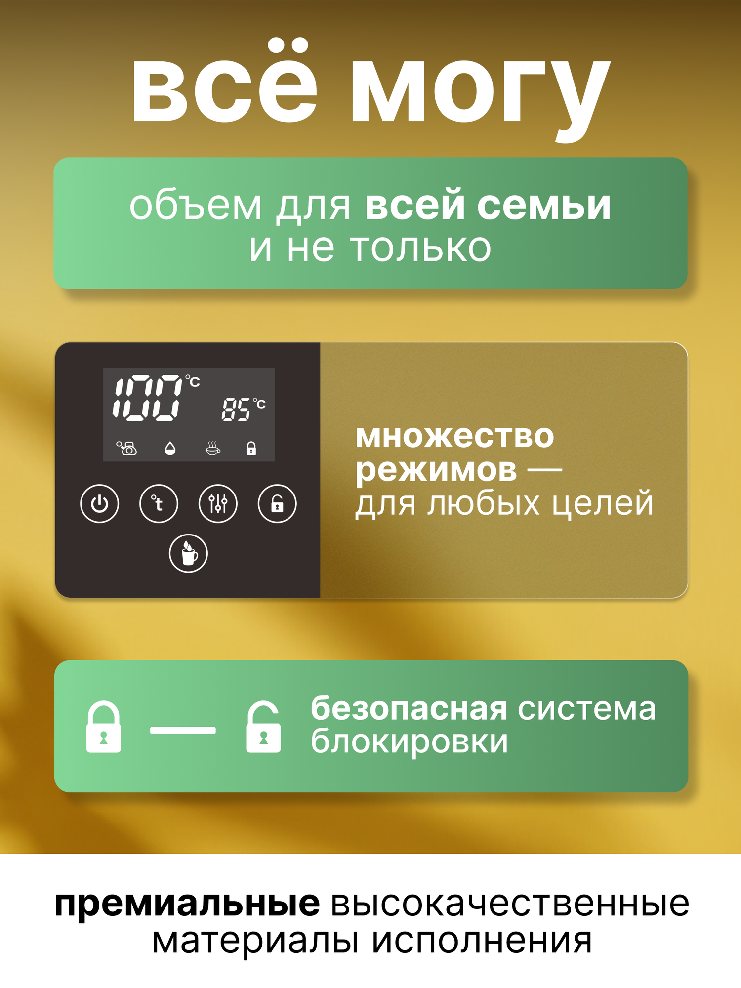 блокировка включения без воды, блокировка крышки, отключение при снятии с подставки